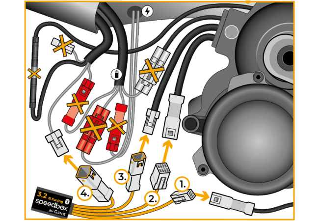 Podczas podłączania Speedboxa 3.2 do silnika Giant w swoim rowerze elektrycznym nie powinniśmy napotkać żadnych problemów w trakcie instalacji. Wszystkie wtyczki zostały oznaczone odpowiednimi kolorami, aby uczynić cały proces szybkim i sprawnym.