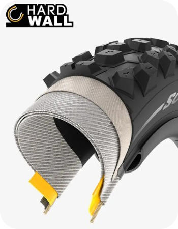 Konstrukcja HardWall z oplotem 60 TPI obejmuje ochronę od stopki do stopki oraz wkładkę z twardej gumy, co zapewnia solidne wsparcie przy niskim ciśnieniu i zwiększa niezawodność oraz komfort jazdy.