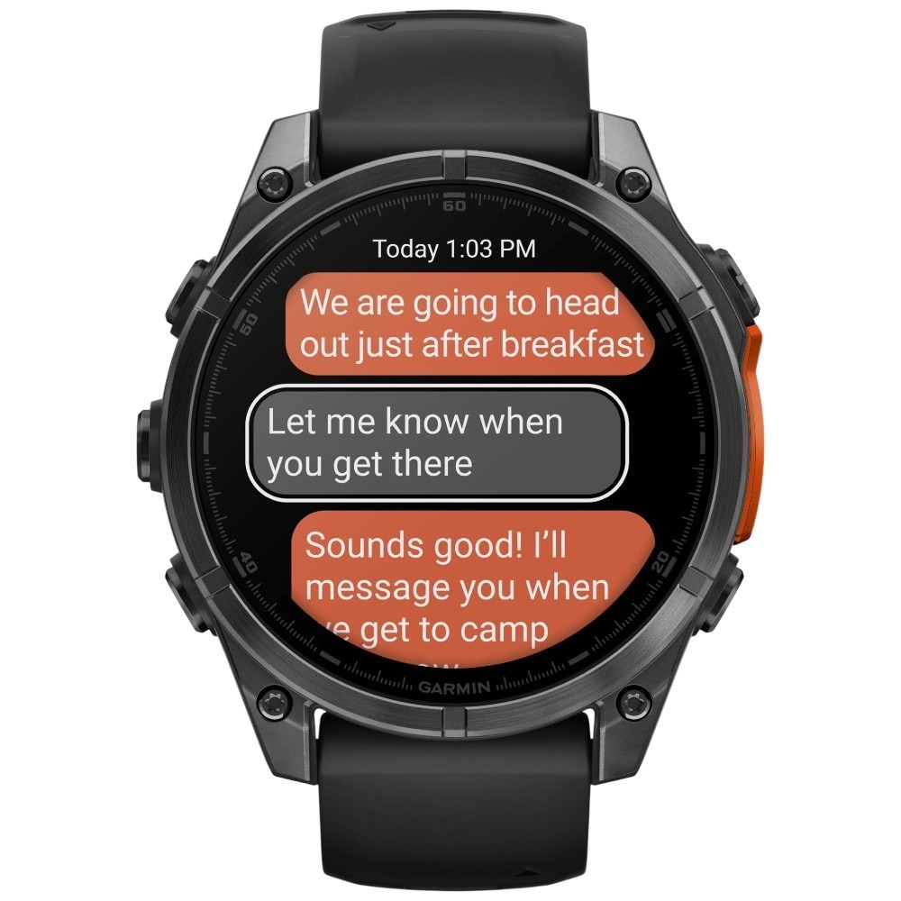 Fenix 8 to pełna łączność na nadgarstku. Po sparowaniu ze smartfonem umożliwia odbieranie powiadomień, prowadzenie rozmów oraz wykonywanie połączeń telefonicznych bezpośrednio z zegarka. Wbudowany mikrofon i głośnik pozwalają korzystać z komend głosowych i asystenta głosowego, co jest niezwykle wygodne podczas biegu czy jazdy na rowerze. Stabilne połączenie zapewnia technologia Bluetooth, a aplikacja Garmin Messenger umożliwia dwukierunkową komunikację nawet poza zasięgiem sieci komórkowej – idealne rozwiązanie podczas wypraw w nieznane.