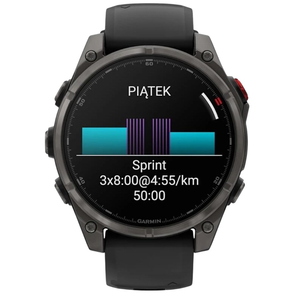 To zaawansowane narzędzie treningowe monitoruje tempo, kadencję, długość kroku i czas kontaktu z podłożem. Funkcja prognozy czasu wyścigów oraz wskazówki tempa pomagają skutecznie planować treningi i utrzymać odpowiedni poziom wysiłku. Fenix 8 Pro automatycznie rejestruje czasy w triathlonie i innych treningach wieloetapowych, umożliwiając korzystanie z gotowych profili lub tworzenie własnych.