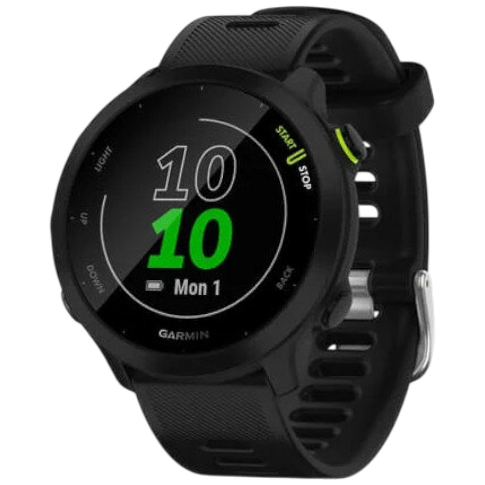 Garmin Forerunner 55 pełni rolę Twojego osobistego trenera – pomaga określić cele, motywuje do regularnej aktywności i dostarcza szczegółowych informacji o postępach. Wbudowany GPS umożliwia dokładne śledzenie dystansu, tempa, interwałów oraz zapis przebytych tras. Zegarek rejestruje również liczbę kroków, minuty intensywnej aktywności oraz inne istotne parametry zdrowotne, byś zawsze wiedział, jak wygląda Twoja forma.