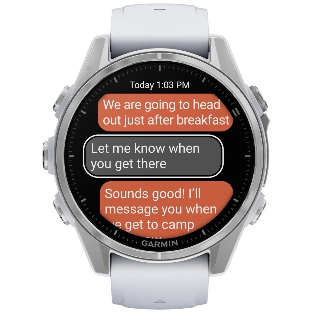 Fenix 8 to pełna łączność na nadgarstku. Po sparowaniu ze smartfonem umożliwia odbieranie powiadomień, prowadzenie rozmów oraz wykonywanie połączeń telefonicznych bezpośrednio z zegarka. Wbudowany mikrofon i głośnik pozwalają korzystać z komend głosowych i asystenta głosowego, co jest niezwykle wygodne podczas biegu czy jazdy na rowerze. Stabilne połączenie zapewnia technologia Bluetooth, a aplikacja Garmin Messenger umożliwia dwukierunkową komunikację nawet poza zasięgiem sieci komórkowej – idealne rozwiązanie podczas wypraw w nieznane.
