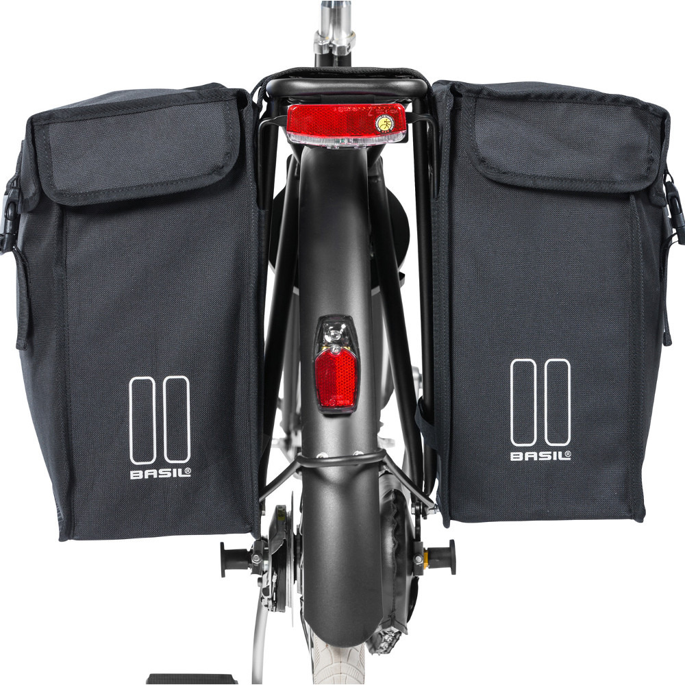 Basil Mara to podwójna torba rowerowa, którą z łatwością można przymocować do bagażnika i będzie doskonałym uzupełnieniem wszystkich rowerów. Dzięki obszernemu, prostokątnemu wnętrzu o pojemności 26 litrów nie zabraknie miejsca na niezbędne rzeczy. Torba jest wykonana z wodoodpornego poliestru, dzięki któremu zawartość pozostanie sucha przy niewielkim deszczu. Nadaje się do użytku z rowerami męskimi i damskimi. Co więcej, odblaskowe detale zapewniają dodatkową widoczność w ciemności, zapewniając bezpieczeństwo na drodze. Specjalne wgłębienia zapewniają indywidualne opcje instalacji, a zapięcie na zatrzask jest gwarancją prawidłowego zabezpieczenia bagażu.