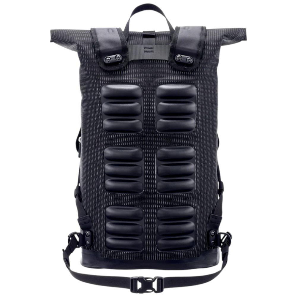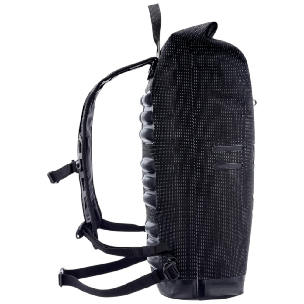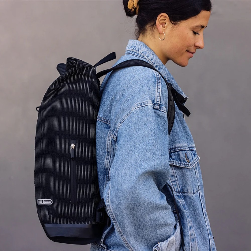 Plecak wykonano z tkaniny Cordura z przędzą odblaskową, która mimo eleganckiego, tekstylnego wyglądu jest w 100% wodoodporna. Materiał silnie odbija światło, znacząco poprawiając widoczność użytkownika. Dzięki zastosowaniu odblaskowej przędzy na całej powierzchni – również na szelkach – plecak zapewnia ochronę w warunkach słabego oświetlenia, deszczu czy mgły.