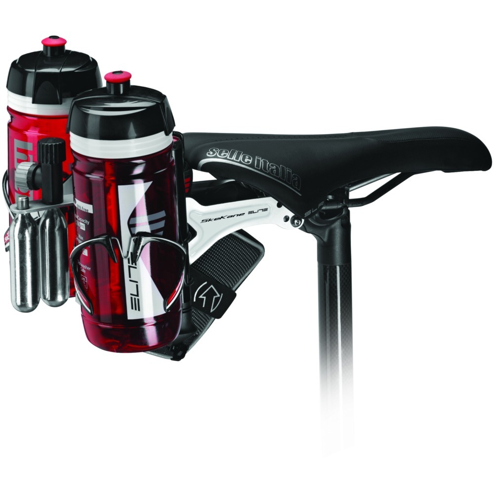 Elite Skekane to specjalne mocowanie do koszyków na bidon za siodełkiem. Idealnie sprawdzi się w triathlonie oraz kolarstwie długodystansowym, gdzie odpowiednie nawodnienie jest kluczowe. Wygodny stelaż jest kompatybilny ze standardowymi prętami metalowymi lub carbonowymi. Pozwala na montaż 2 dodatkowych koszyków na bidon oraz niezbędnych narzędzi takich jak multitool i pompka z nabojami CO2. Umiejscowienie dodatkowych bidonów za kolarzem nie wpływa negatywnie na aerodynamikę czyniąc Elite Skekane rozwiązaniem idealnym.
