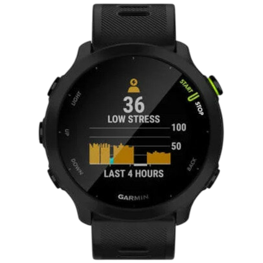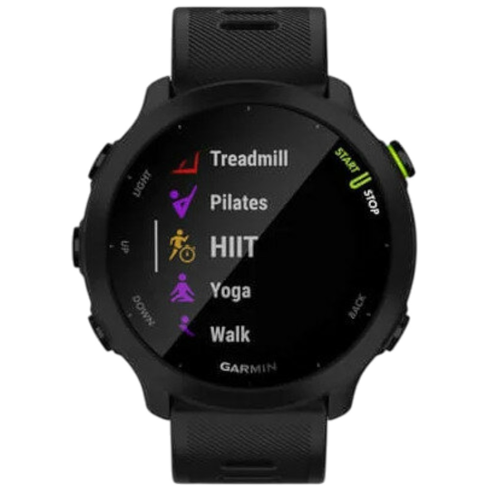 Garmin Forerunner 55 pełni rolę Twojego osobistego trenera – pomaga określić cele, motywuje do regularnej aktywności i dostarcza szczegółowych informacji o postępach. Wbudowany GPS umożliwia dokładne śledzenie dystansu, tempa, interwałów oraz zapis przebytych tras. Zegarek rejestruje również liczbę kroków, minuty intensywnej aktywności oraz inne istotne parametry zdrowotne, byś zawsze wiedział, jak wygląda Twoja forma.