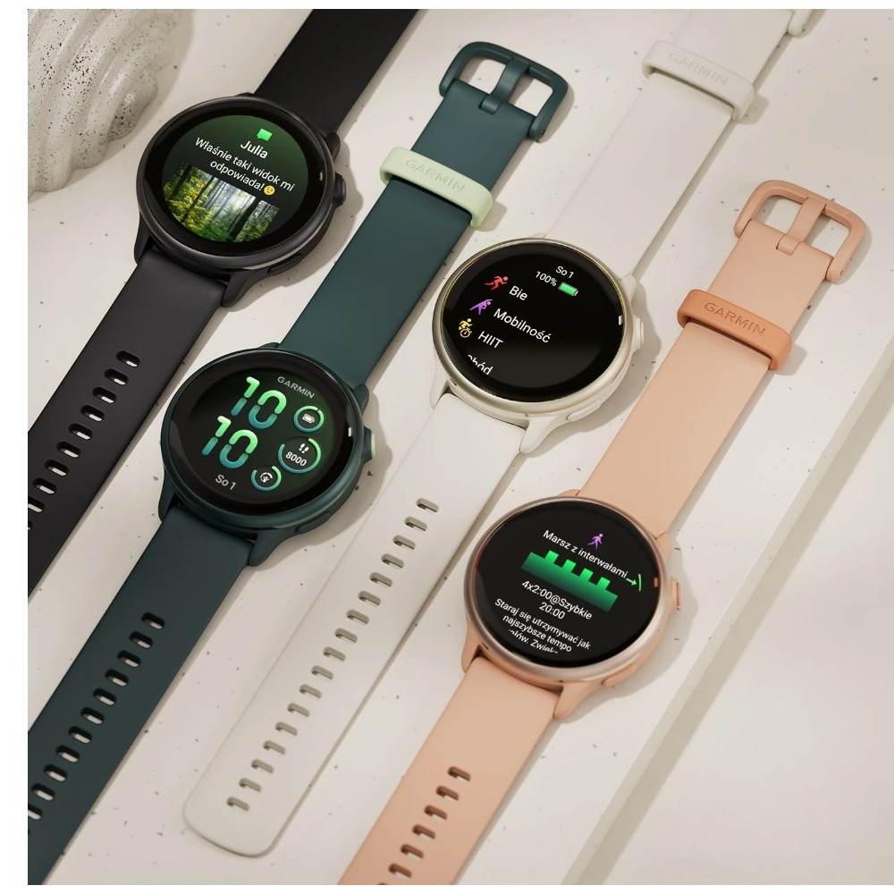 | Funkcje użytkowe | Akcelerometr, Body battery, Ćwiczenia oddechowe, Dziennik treningu, Funkcje treningowe, Medytacja, Minutnik oddychania relaksacyjnego, Monitor menstruacji, Monitor snu, Monitorowanie nawodnienia, Move IQ, Pogoda, Powiadomienia o zbyt wysokim lub niskim tętnie, Przypomnienia o relaksie, Rytm oddychania, Śledzenie stresu, Wiek sprawnościowy, Wykrywanie drzemek, Wyświetlanie powiadomień, Garmin Pay, |