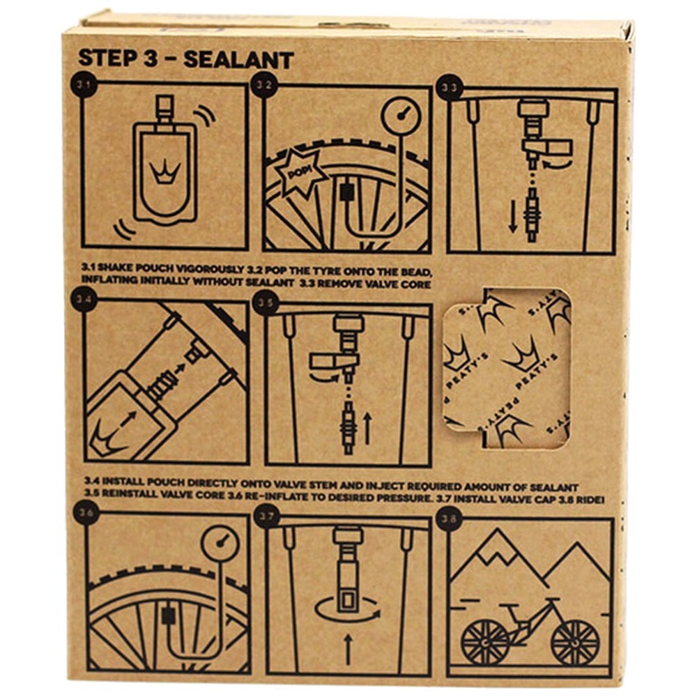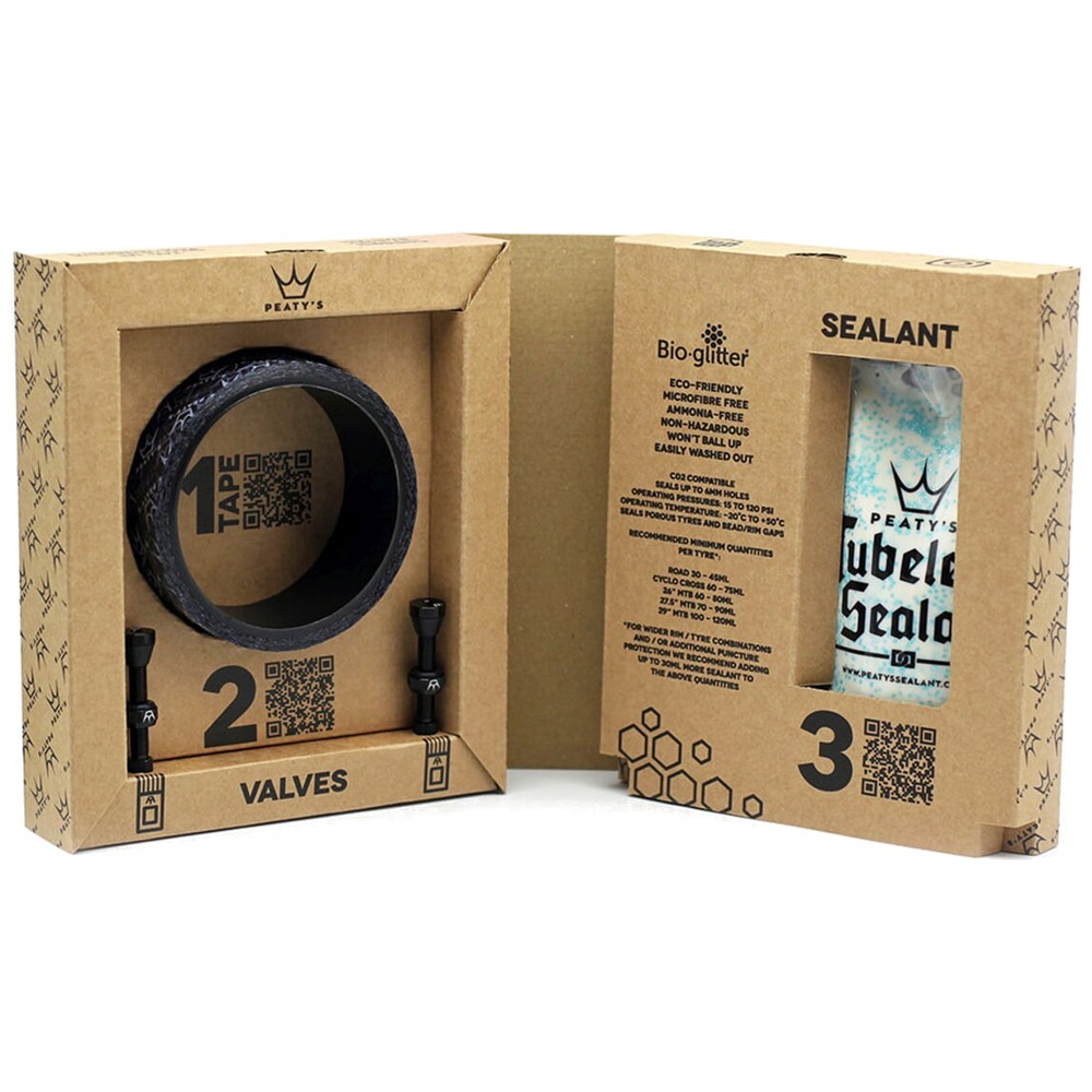 Peaty's Holeshot Tubeless Conversion Kit umożliwiający dokonanie konwersji na system bezdętkowy. W skład zestawu wchodzą taśma na obręcz, dwa wentyle oraz uszczelniacz w torebce. Na tylnej stronie opakowania znalazła się instrukcja montażu oraz kod QR do filmów producenta. Zestaw przeznaczony został do wykorzystania z downhill oraz enduro.