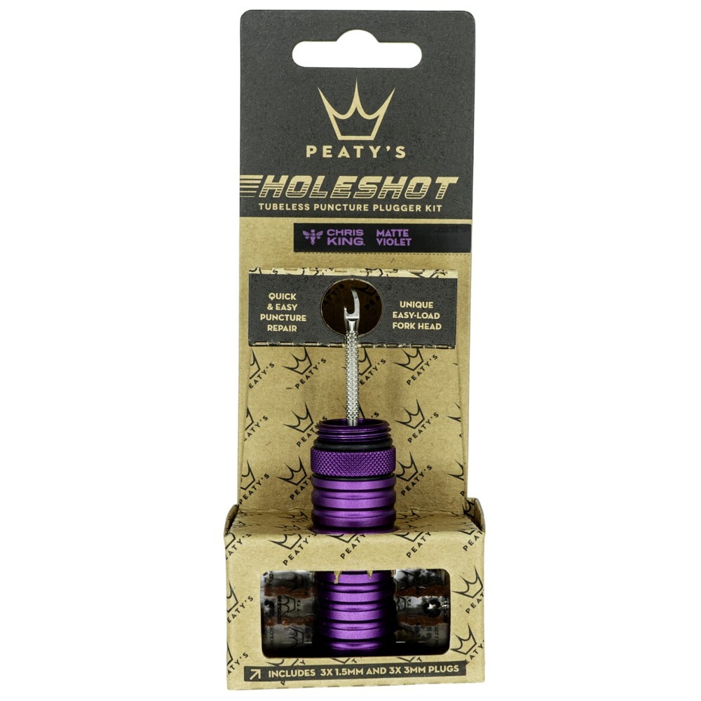 Peaty's Holeshot Plugger Kit to zestaw naprawczy pozwalający załatać dziurę, gdy zawiódł uszczelniacz. Aplikator został wykonany z wysokiej jakości stali nierdzewnej i jest na tyle wąski, aby nie powiększać przebicia. Jego długość została zmniejszona, aby zapobiec uszkodzeniu taśmy na obręczy, a frez na jego powierzchni pozwala oczyścić dziurę podczas wkładania kołka. Całość została zamknięta w niewielkiej obudowie, którą zmieścisz w plecaku, ramie lub kieszeni i zawsze będzie gotowy do użycia. Jego korpus został wykonany z anodowanego aluminium i zabezpieczony oringiem przed wilgocią. Zestaw dostępny jest w 12 unikalnych kolorach z palety Chris King.