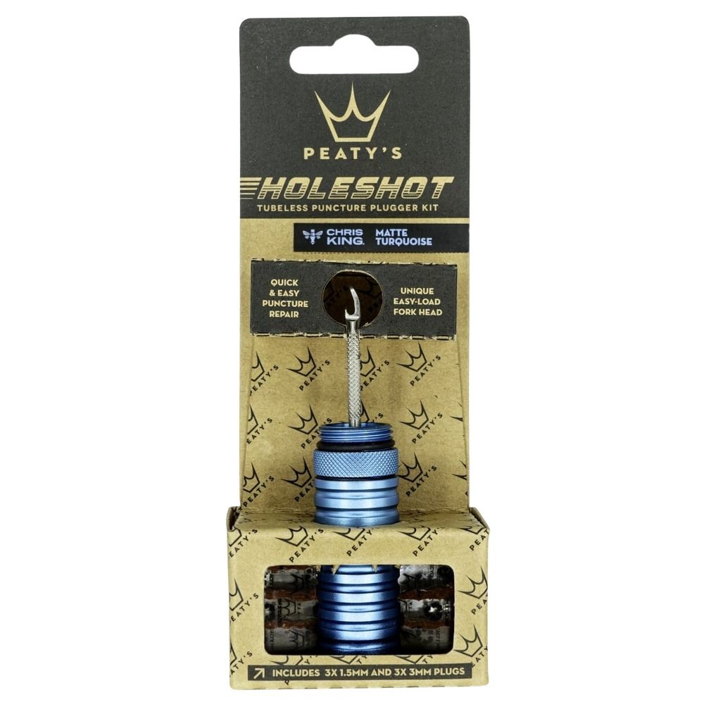 Peaty's Holeshot Plugger Kit to zestaw naprawczy pozwalający załatać dziurę, gdy zawiódł uszczelniacz. Aplikator został wykonany z wysokiej jakości stali nierdzewnej i jest na tyle wąski, aby nie powiększać przebicia. Jego długość została zmniejszona, aby zapobiec uszkodzeniu taśmy na obręczy, a frez na jego powierzchni pozwala oczyścić dziurę podczas wkładania kołka. Całość została zamknięta w niewielkiej obudowie, którą zmieścisz w plecaku, ramie lub kieszeni i zawsze będzie gotowy do użycia. Jego korpus został wykonany z anodowanego aluminium i zabezpieczony oringiem przed wilgocią. Zestaw dostępny jest w 12 unikalnych kolorach z palety Chris King.