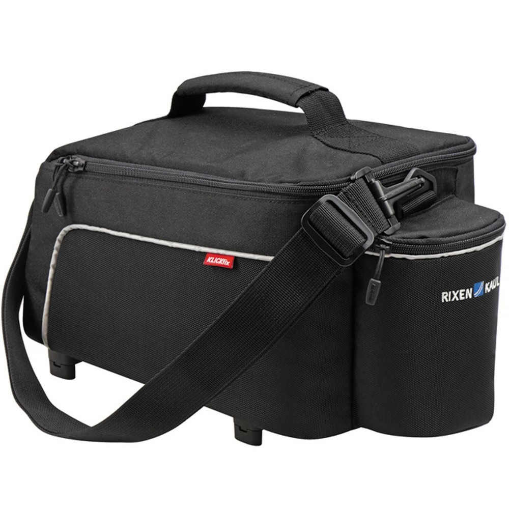 Smukła torba na tylny bagażnik KLICKfix Rackpack Light, która posiada sporą, wyściełaną komorę główną, kieszeń wewnętrzną oraz zewnętrzną kieszeń na bidon z zabezpieczającym ściąganym sznurkiem. Torba została także wyposażona w krótki uchwyt oraz pasek na ramię, które pozwalają ją wygodnie przenosić. Odblaskowe lamówki pojawiające się z tyłu oraz po bokach torby zapewniają rowerzyście bezpieczną jazdę poprawiając jego widoczność na drodze. Do torby dołączono osłonę przeciwdeszczową, która po założeniu doskonale chroni ją przed przemoknięciem. Rackpack Light została także wyposażona w mocowanie Racktime Vario. Koszyki, torby oraz inne akcesoria rowerowe z takim mocowaniem mogą być stosowane tylko na specjalnych bagażnikach Racktime posiadających charakterystyczne otwory, w które wsuwane są kołki adaptera.