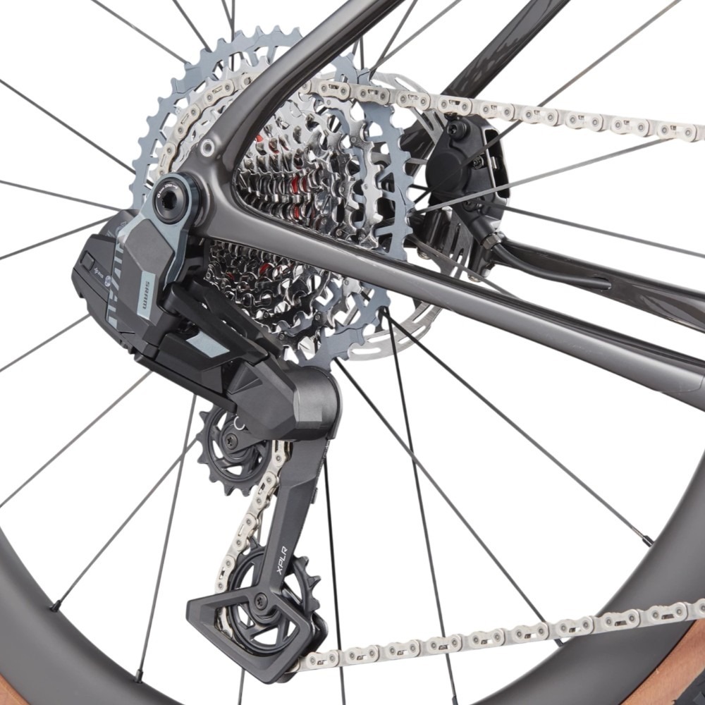 Model korzysta z osprzętu amerykańskiej produkcji – SRAM Rival AXS. 13-rzędowa, precyzyjnie działająca przerzutka elektroniczna bez problemu radzi sobie w trudniejszym terenie. Należy ona do linii XPLR, opracowanej specjalnie z myślą o rowerach gravelowych – rozwiązania te bazują na doświadczeniach marek takich jak SRAM, Rock Shox czy Zipp. Szeroki zakres przełożeń z jednym blatem umożliwia rozwijanie wysokich prędkości na zjazdach, a jednocześnie ułatwia pokonywanie stromych podjazdów.
