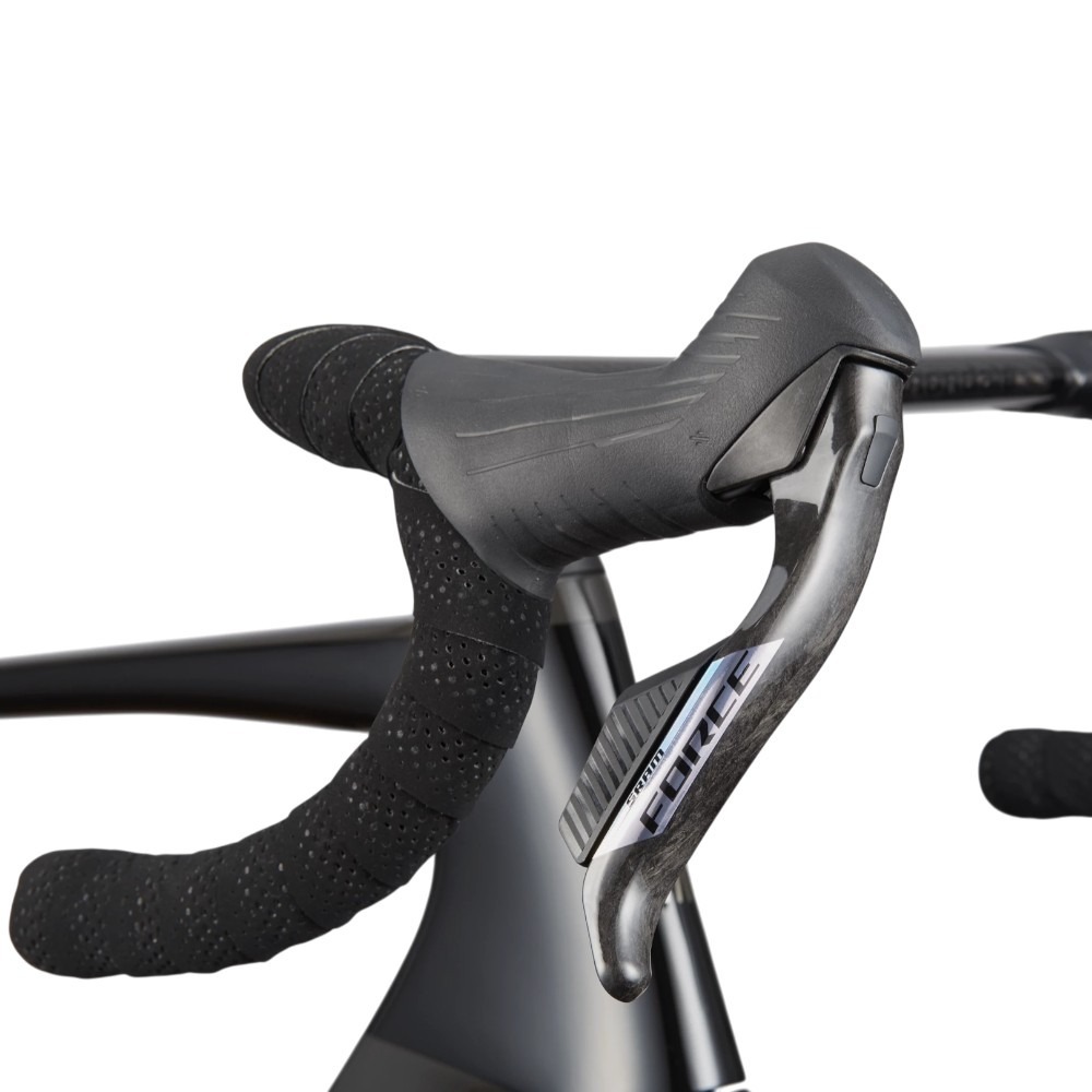 Model Cannondale SuperSix EVO 1 wyposażono w jedną z najbardziej zaawansowanych grup osprzętu na świecie – SRAM Force AXS w konfiguracji 2x12. Elektroniczna zmiana przełożeń zapewnia błyskawiczne i niezwykle precyzyjne działanie napędu, co ma kluczowe znaczenie podczas intensywnej jazdy. Z tej samej serii pochodzą hydrauliczne hamulce tarczowe, które gwarantują wysoką skuteczność hamowania niezależnie od warunków atmosferycznych na dworze.