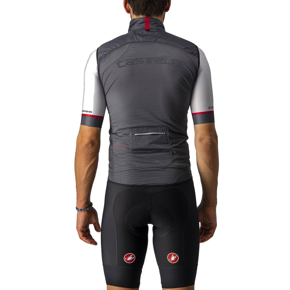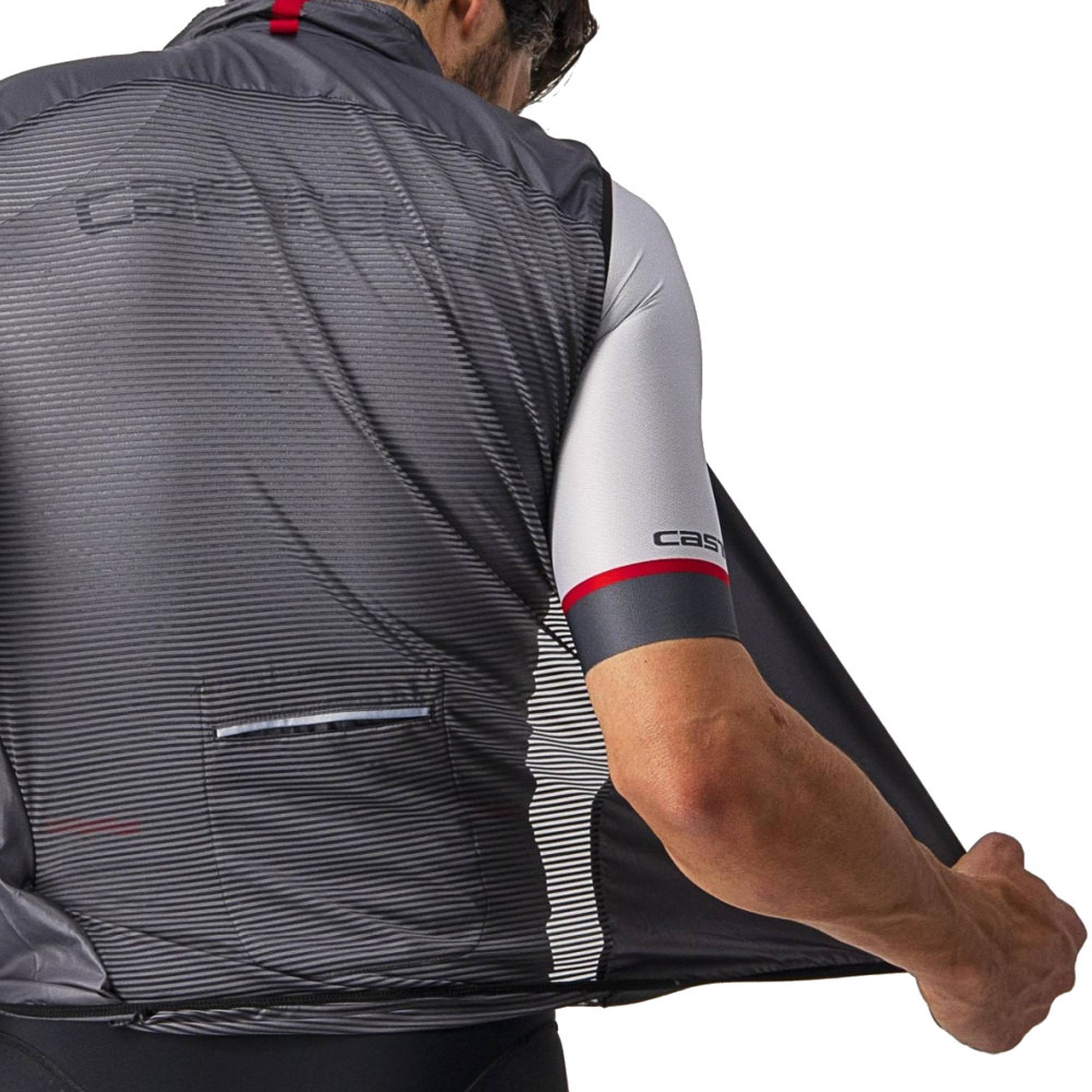 Castelli Aria Vest to niezwykle lekka kamizelka kolarska, zapewniająca doskonałą ochronę przed wiatrem w czasie jazdy. Przód kamizelki został wykonany z miękkiej microfibry całkowicie blokującej dopływ wiatru. Tył i boki z siateczki przepuszczają ciepło dbając o skuteczną wymianę termiczną, więc jednocześnie nie przegrzejesz się. Siateczka jest elastyczna, więc kamizelka świetnie przylega do ciała, dzięki czemu nie tworzy dodatkowego oporu i nie trzepocze na wietrze. Kamizelka na rower Castelli Aria Vest zapinana jest na całej długości na wytrzymały zamek YKK® Vislon®, który znacznie zwiększa komfort jej użytkowania.