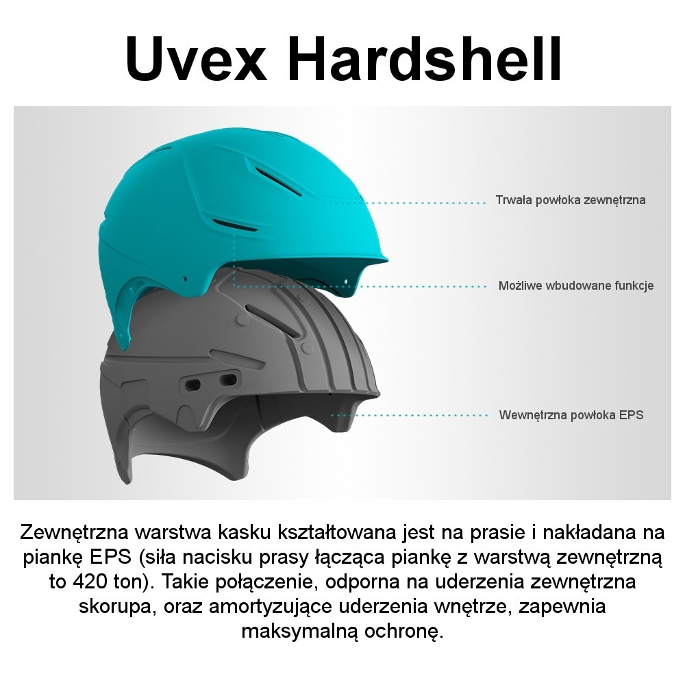 Hardshell - Zewnętrzna warstwa kasku kształtowana jest na prasie i nakładana na piankę EPS (siła nacisku prasy łącząca piankę z warstwą zewnętrzną to 420 ton). Takie połączenie, odporna na uderzenia zewnętrzna skorupa, oraz amortyzujące uderzenia wnętrze, zapewnia maksymalną ochronę.