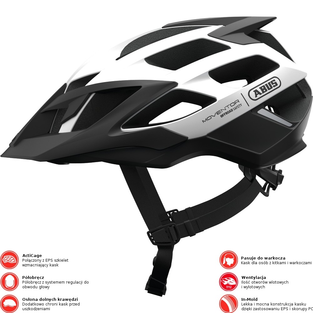 Sektor kasów All-Mountain rozwija się bardzo dynamicznie. Coraz bardziej wymagające szlaki i coraz lepsza technika jazdy wymagają jeszcze więcej ochrony. Kask rowerowy MTB Abus Moventor spełnia wszystkie wymagania zaawansowanego zawodnika MTB. Posiada cechy idealnego kasku - jest lekki, niezwykle wygodny i posiada wysokiej klasy wentylację. Wypełnienie EPS, zewnętrzne skorupy z poliwęglanu oraz dodatkowe wzmocenienie za pomocą systemu ActiCage sprawiają, że jest to bardzo bezpieczny kask, ale też niezwykle odporny na mikrowstrząsy i upadki podczas jazdy. Kask rowerowy MTB Abus Moventor świetnie się sprawdza podczas użytkowania zarówno w terenie, jak i w mieście.