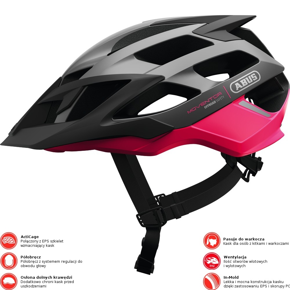 Sektor kasów All-Mountain rozwija się bardzo dynamicznie. Coraz bardziej wymagające szlaki i coraz lepsza technika jazdy wymagają jeszcze więcej ochrony. Kask rowerowy MTB Abus Moventor spełnia wszystkie wymagania zaawansowanego zawodnika MTB. Posiada cechy idealnego kasku - jest lekki, niezwykle wygodny i posiada wysokiej klasy wentylację. Wypełnienie EPS, zewnętrzne skorupy z poliwęglanu oraz dodatkowe wzmocenienie za pomocą systemu ActiCage sprawiają, że jest to bardzo bezpieczny kask, ale też niezwykle odporny na mikrowstrząsy i upadki podczas jazdy. Kask rowerowy MTB Abus Moventor świetnie się sprawdza podczas użytkowania zarówno w terenie, jak i w mieście.