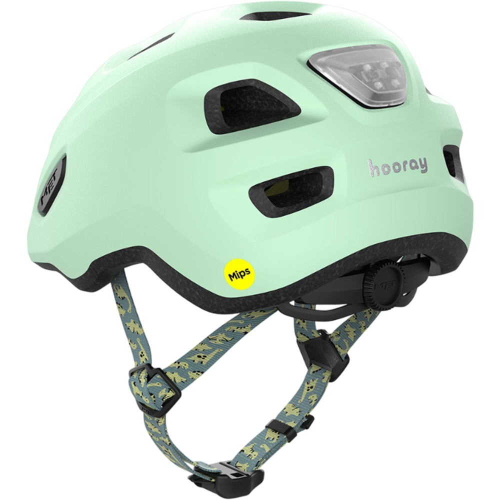 Kask MET Hooray MIPS gwarantuje doskonałą wentylację dzięki 10 otworom wentylacyjnym oraz posiada wbudowaną siatkę przeciw owadom. System MET Safe-T Bimbo Fit z pasem na głowę 360 stopni pozwala na idealne dopasowanie do rosnącej głowy dziecka, a regulowane paski zapewniają indywidualne dopasowanie. Dla lepszej widoczności na drodze wyposażono go w tylne światło LED MET z 4 diodami o żywotności do 60 godzin oraz odblaskową naklejkę zwiększającą bezpieczeństwo po zmroku.