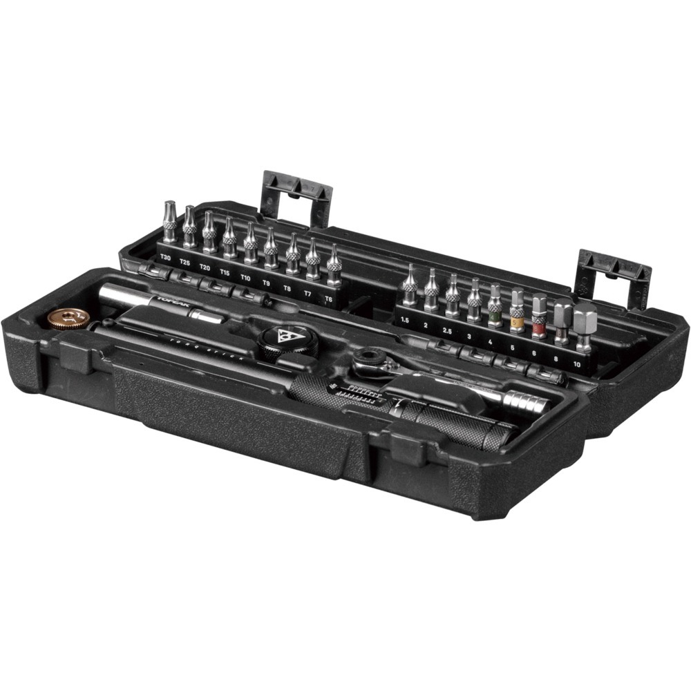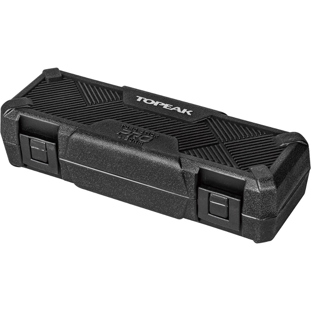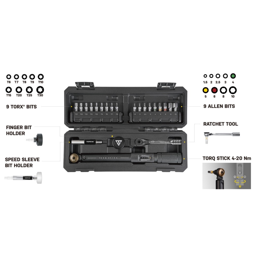 Klucz dynamometryczny Topeak Torq Stick Pro z regulowanym zakresem od 4 do 20 NM pozwala precyzyjnie dobrać moment dokręcenia. Bogato wyposażone pudełko skrywa 9 bitów Torx, 9 bitów imbusowych, krótki uchwyt do bitów, uchwyt Speed Sleeve z przedłużona tuleją do szybkiego montażu. Poza tym znajdziemy oczywiście klucz dynamometryczny oraz klucz z grzechotką. Poszczególne elementy można ze sobą łączyć np. klucz z grzechotką z kluczem Speed Sleeve pozwoli na dotarcie do najtrudniej dostępnych śrub.