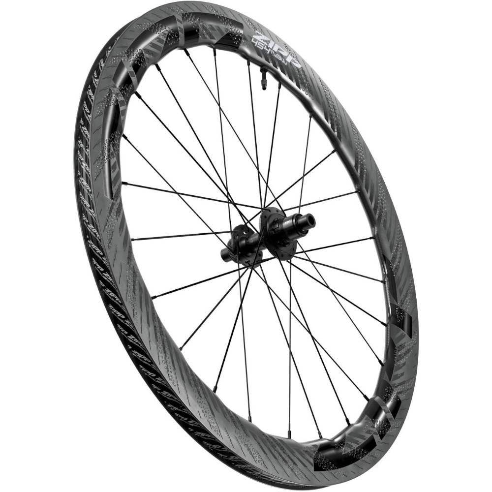 Obręcz w tym modelu jest symetryczna i wykonana z włókna węglowego, tzw. karbon zapewnia wysoką trwałość, a przy tym jest nieziemsko lekki. Wysokość obręczy jest zmienna w zakresie 53-58 mm, poprzez falistą formę (Sawtooth). Takie rozwiązanie poprawia stabilność koła przy bocznych podmuchać wiatru. Oprócz tego obręcz ma szerszy profil wewnętrzny niż standardowo, co pozwala na zastosowanie opon o większej objętości, a te zmniejszają opory toczenia oraz efektywniej tłumią drgania od podłoża. Projektanci z marki Zipp postawili także na pozbawienie obręczy haka (konstrukcja hookless), dzięki czemu przejście między oponą a obręczą jest płynniejsze – wpisuję się to w założenia marki, dążące do maksymalnej wydajności (Total System Efficiency).