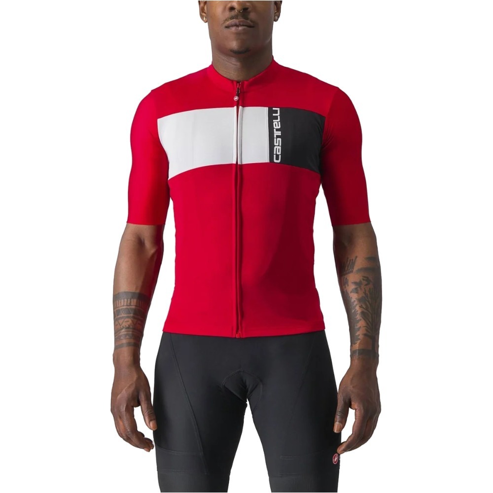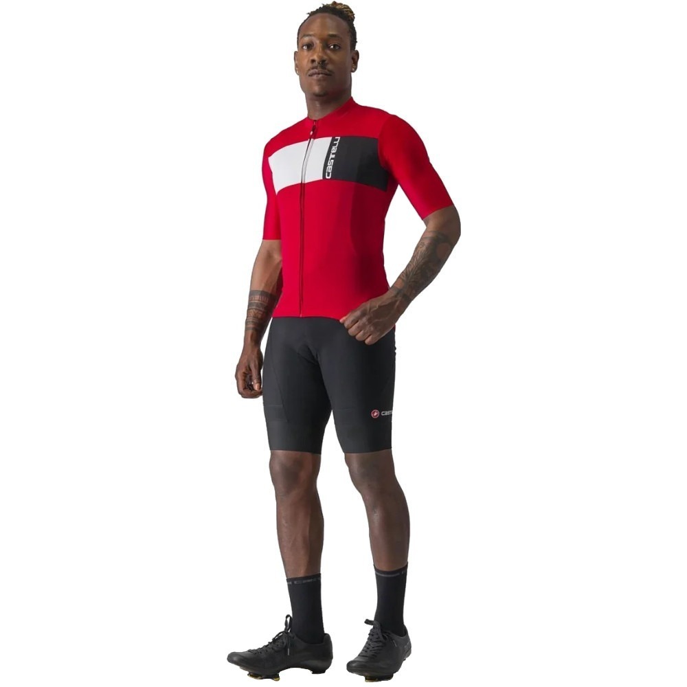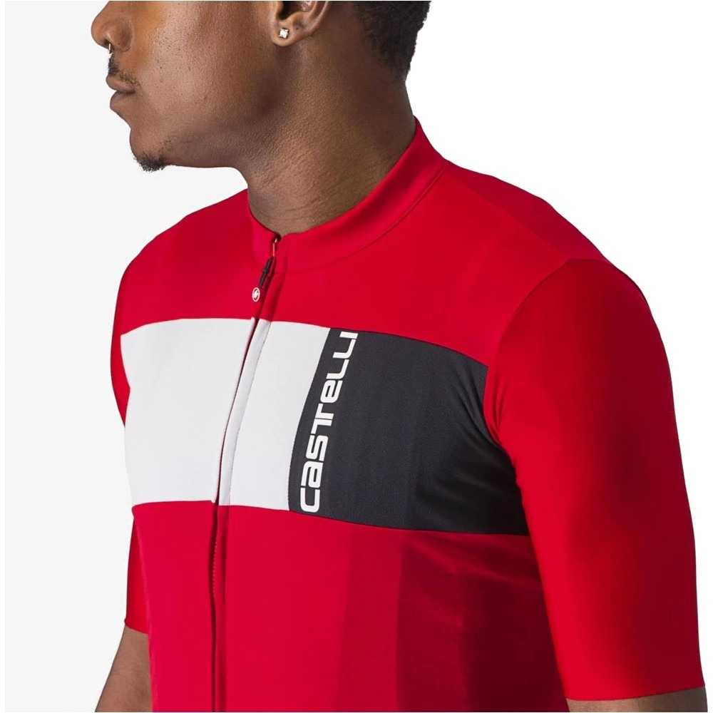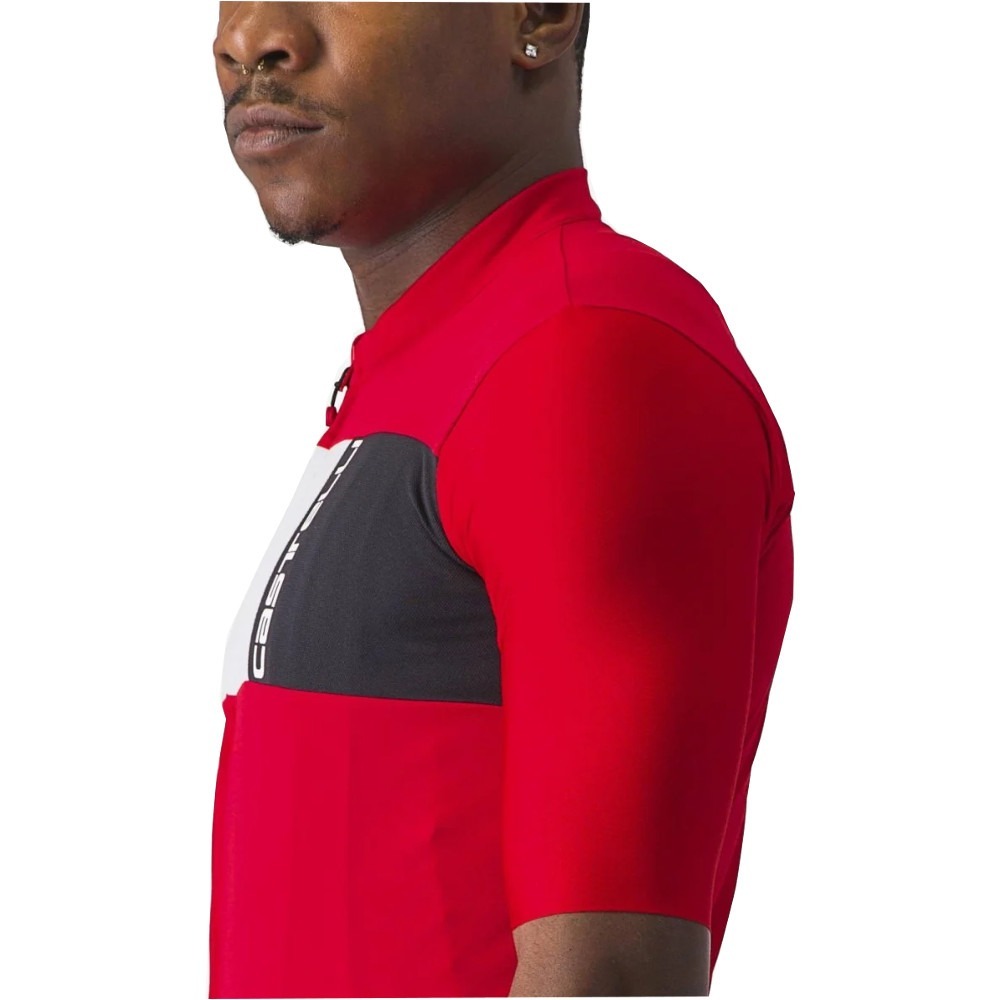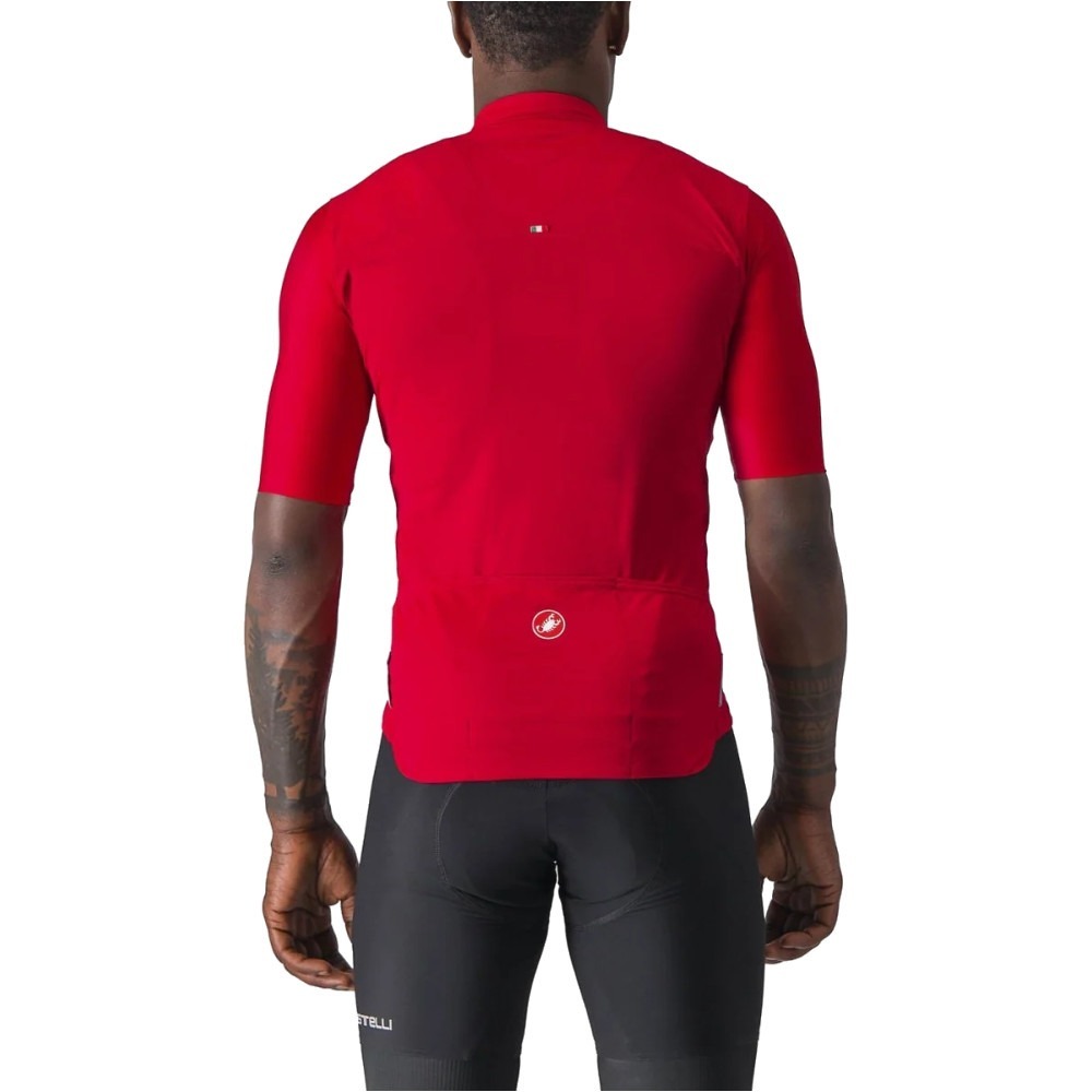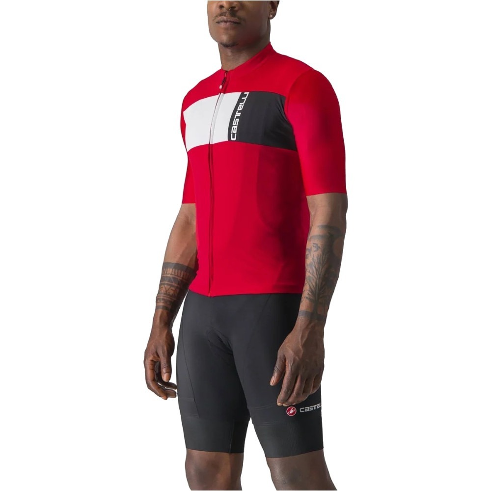 Castelli Prologo 7 to dopasowana koszulka kolarska o wygodnym, elastycznym kroju. Materiał, z którego wykonano koszulkę, zapewnia bardzo dobrą ochronę przeciwsłoneczną. Ponadto świetnie radzi sobie z odprowadzaniem wilgoci, co znacznie poprawia komfort jazdy. Korpus Prologo 7 został wykonany z poliestrowej dzianiny, natomiast do wykonania rękawków wykorzystano rozciągliwą tkaninę Velocity Rev2. Rękawki sięgają do łokci i zostały zakończone surowym cięciem. Bardzo dobrze przylegają do ciała i zarazem nie powodują odgnieceń na skórze. W tylnej części koszulki umieszczono potrójną kieszeń, która mieści najpotrzebniejsze rzeczy i zapewnia do nich łatwy, wygodny dostęp. Ponadto po obu stronach kieszeni znajdują się odblaskowe wstawki, które gwarantują bezpieczniejszą jazdę w warunkach słabej widoczności. Na całej długości koszulki Prologo 7 umieszczono zapięcie na zamek YKK Vislon, co umożliwia bardzo szybkie i wygodne zakładanie oraz ściąganie ubrania.