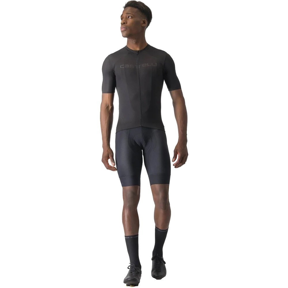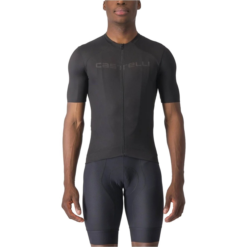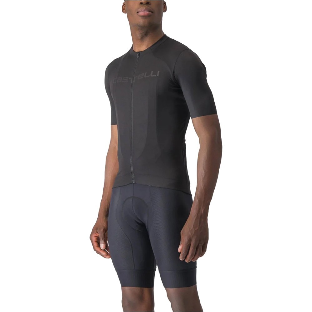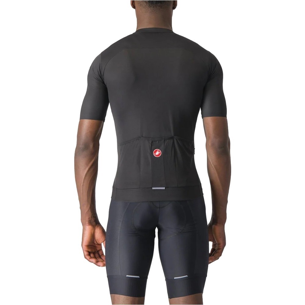 Castelli Prologo Lite wykonana jest z lekkiego i dającego świetne odprowadzanie wilgoci oraz oddychalność materiału poliestrowego. Krój ubrania jest regularny, komfortowy, co ułatwia jego dopasowanie się do sylwetki kolarza. Warto zauważyć także, że rękawy koszulki rowerowej Castelli Prologo Lite zakończono w taki sposób, by nie podwijały się w czasie jazdy oraz nie uciskały ręki.