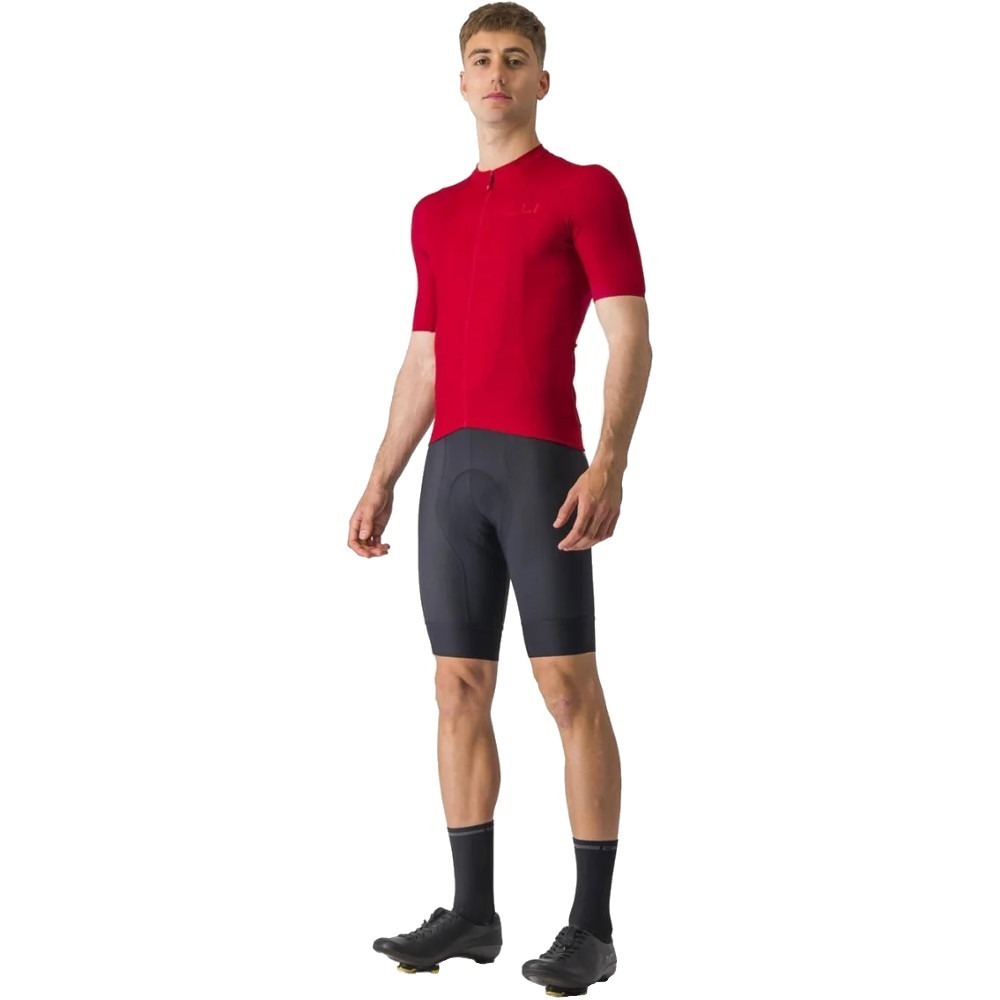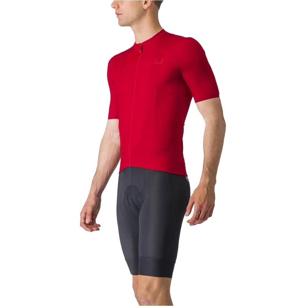 Castelli Prologo Lite wykonana jest z lekkiego i dającego świetne odprowadzanie wilgoci oraz oddychalność materiału poliestrowego. Krój ubrania jest regularny, komfortowy, co ułatwia jego dopasowanie się do sylwetki kolarza. Warto zauważyć także, że rękawy koszulki rowerowej Castelli Prologo Lite zakończono w taki sposób, by nie podwijały się w czasie jazdy oraz nie uciskały ręki.