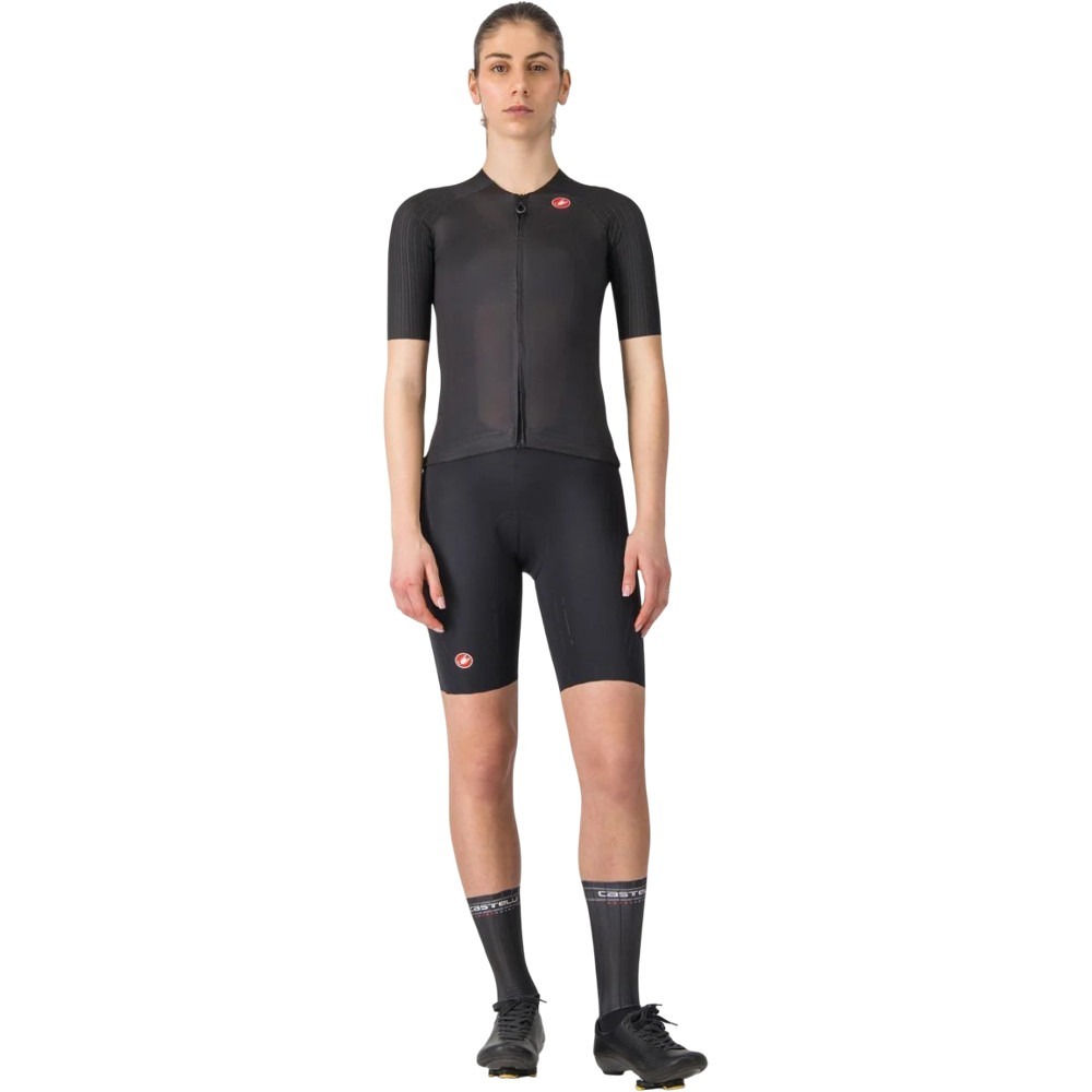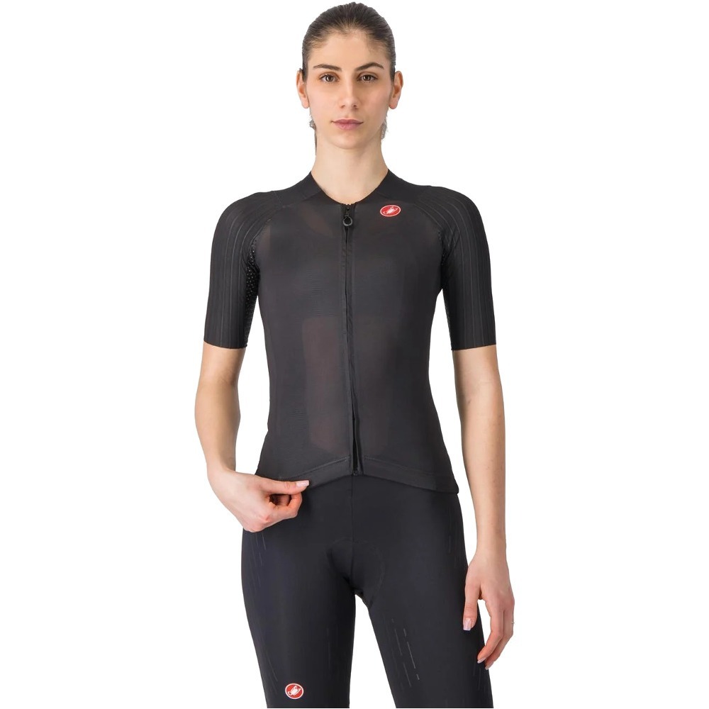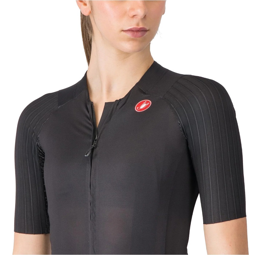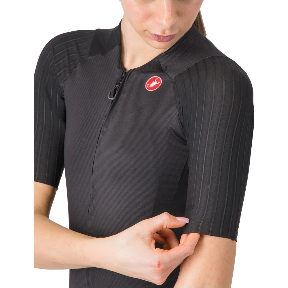 Koszulka Castelli Aero Race 8S W została specjalnie zaprojektowana dla kobiet, oferując doskonałe dopasowanie i najwyższą funkcjonalność. Producent zadbał nie tylko o innowacyjne rozwiązania, ale także o efektowny design. Rękawy zoptymalizowano przy użyciu inżynierii CFD, co pozwoliło na precyzyjne rozmieszczenie szwów. Prążkowana struktura na ramionach zapewnia znaczącą przewagę aerodynamiczną, redukując opór o 6% w porównaniu do wcześniejszych modeli. Korpus koszulki wykonano z gładkiego, elastycznego materiału, który doskonale dopasowuje się do sylwetki, oferując jednocześnie niezrównany komfort.