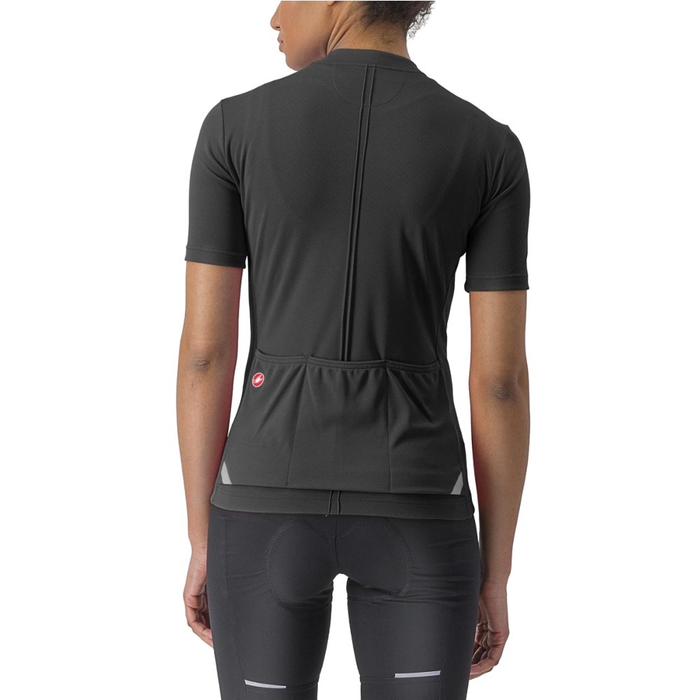 Jest przy tym bardzo funkcjonalna. Niski kołnierzyk zapobiega przewianiu okolic karku. Zamek błyskawiczny YKK® Vislon® pozwala na szybkie rozpięcie. Bez problemu można go obsłużyć jedną ręką. Silikonowy, elastyczny ściągacz w pasie trzyma koszulkę na miejscu i uniemożliwia jej przesuwanie się czy podciąganie nawet przy intensywnych treningach. Lekko opuszczony tył świetnie dopasowuje damską koszulkę Castelli Anima 3 do sylwetki i pozycji przyjmowanej podczas jazdy, a tylne kieszenie umożliwiają zabranie ze sobą kilku drobiazgów. Kieszenie również znajdują się w lekko obniżonej konstrukcji, co znacząco ułatwia wyciąganie i wkładanie rzeczy do nich podczas jazdy. Odblaskowe lamówki to zapewniona widoczność i bezpieczeństwo poruszania się po słabiej doświetlonych punktach trasy.