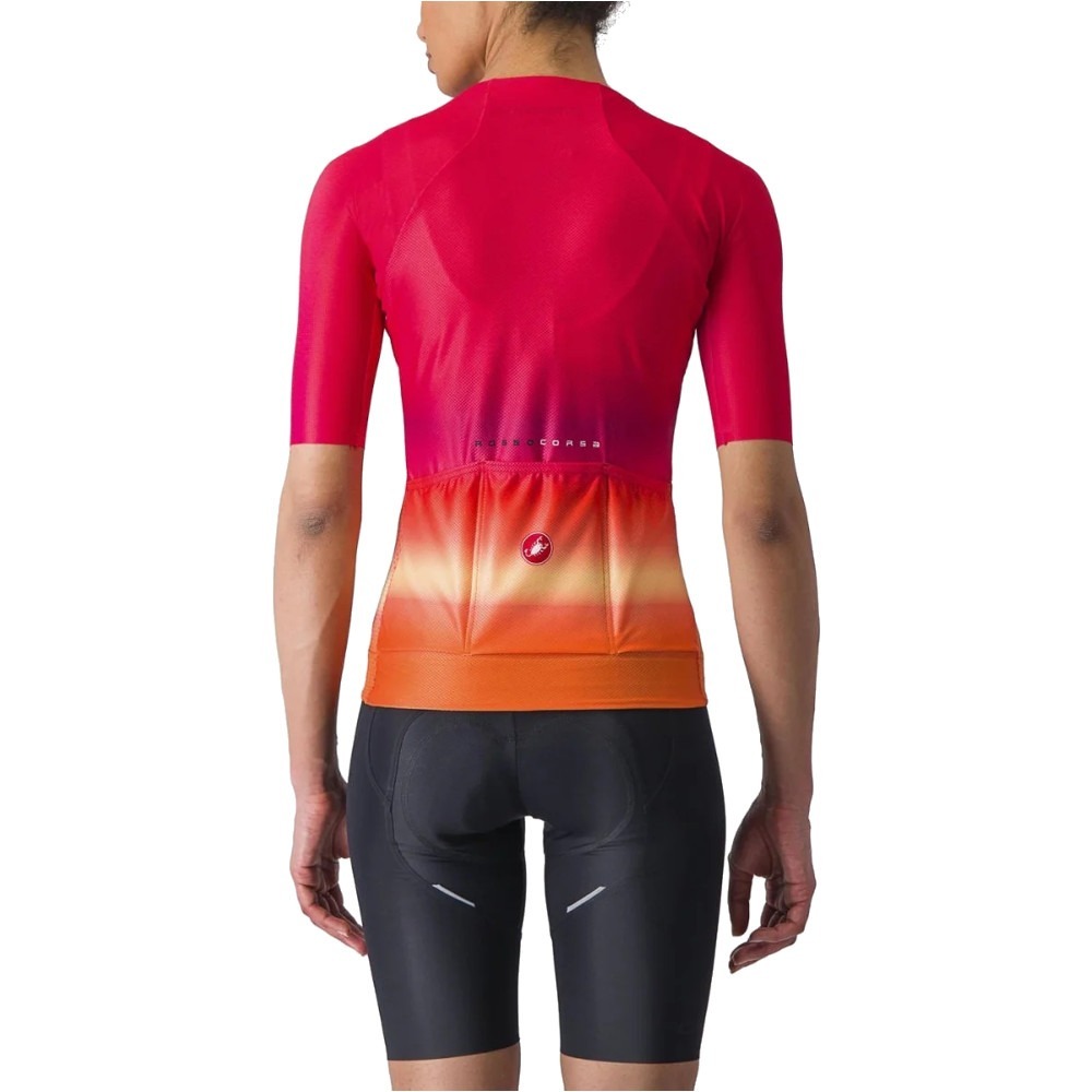 Koszulka rowerowa damska Castelli Climber's 2.0 W przygotowana została przez włoską markę do użytkowania podczas wyścigów i treningów w najgorętsze dni w roku. Jeżeli w samym środku lata pragniesz cieszyć się maksymalną aerodynamicznością, koszulka rowerowa damska Castelli Climber's 2.0 W sprawdzi się wybornie! Trzeba zauważyć, że model ma etykietę Rosso Corsa, co oznacza, że należy on do elitarnej grupy premium produktów włoskiego przedsiębiorstwa.