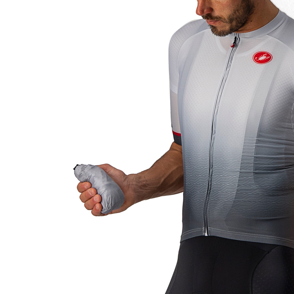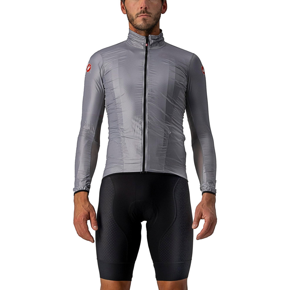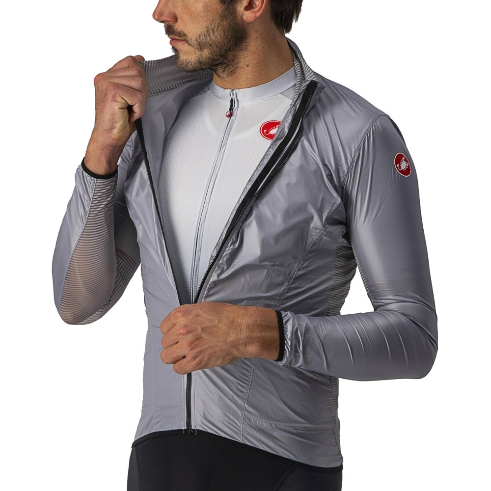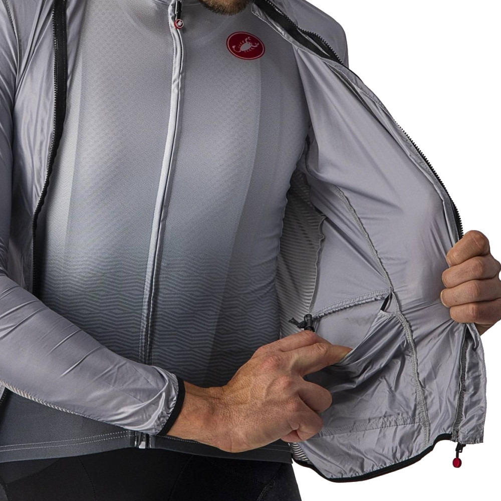 Castelli Aria Shell to kurtka kolarska zapewniająca dobrą ochronę przed wiatrem. Doskonale dopasowuje się do sylwetki za sprawą elastycznej siateczki, z której wykonano wewnętrzną część rękawów. Dzięki temu nie ogranicza ruchów i zapewnia wygodę noszenia. Przednia część wyprodukowana została z mikrofibry, jest więc miła w dotyku i komfortowa. Kurtka rowerowa Castelli Aria Shell jest kompaktowa i bez problemu można ją składać do zintegrowanego worka. Po tym zabiegu zmieści się nawet w tylnej kieszonce koszulki rowerowej, więc bez problemu możesz zabierać ją ze sobą, by mieć pewność, że pogoda Cię nie zaskoczy. Dla poprawy twojego bezpieczeństwa, producent umieścił na kurtce elementy odblaskowe, które znacznie zwiększają widoczność na drodze. Kurtka na rower Castelli Aria Shell zapinana jest na całej długości na wytrzymały zamek YKK Vislon.