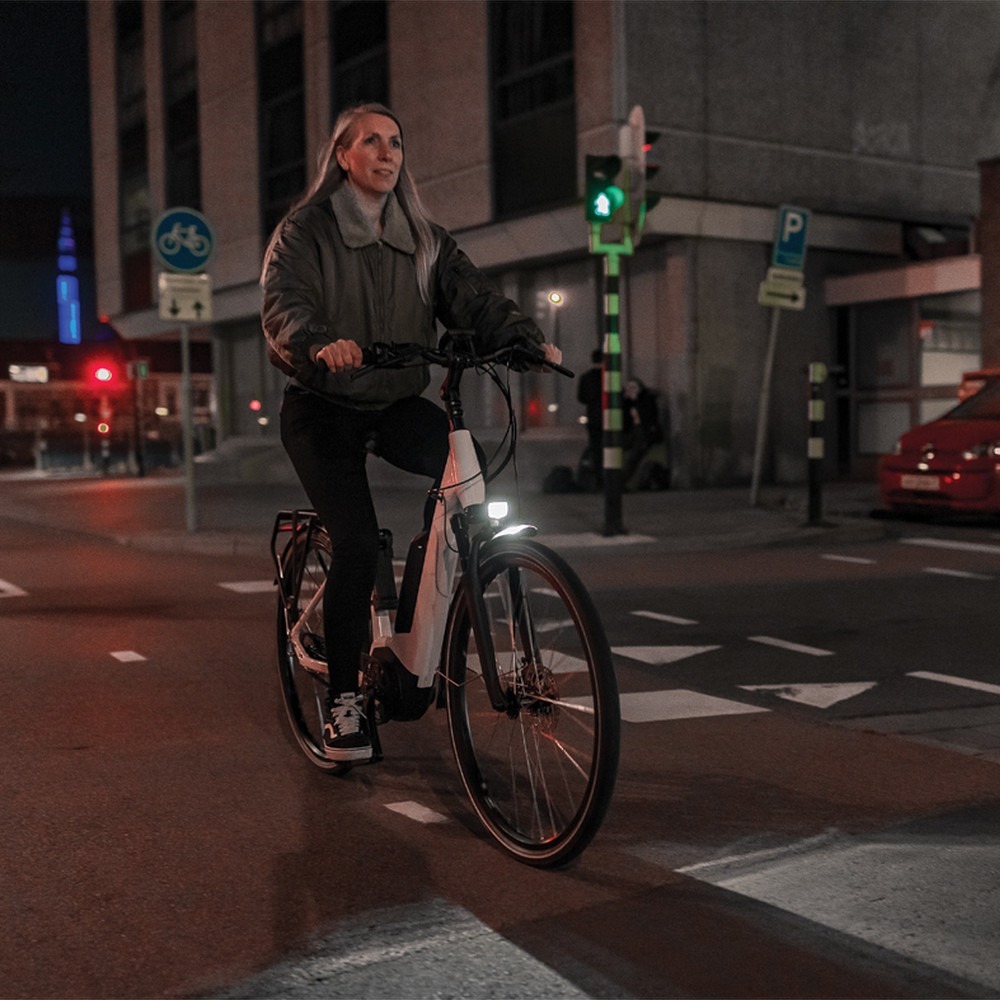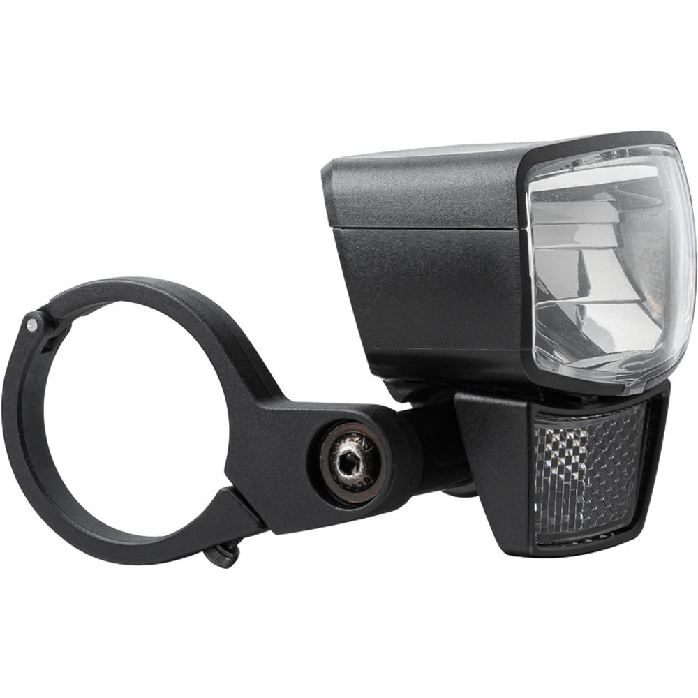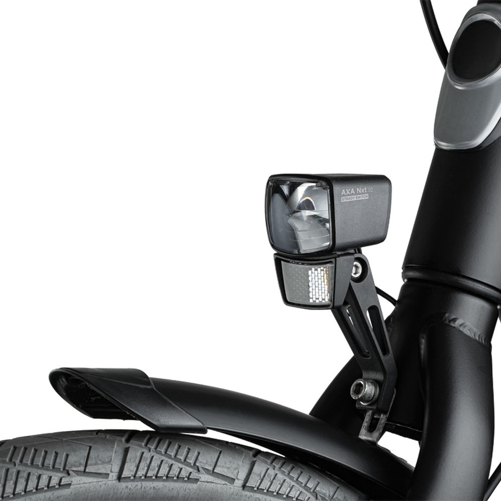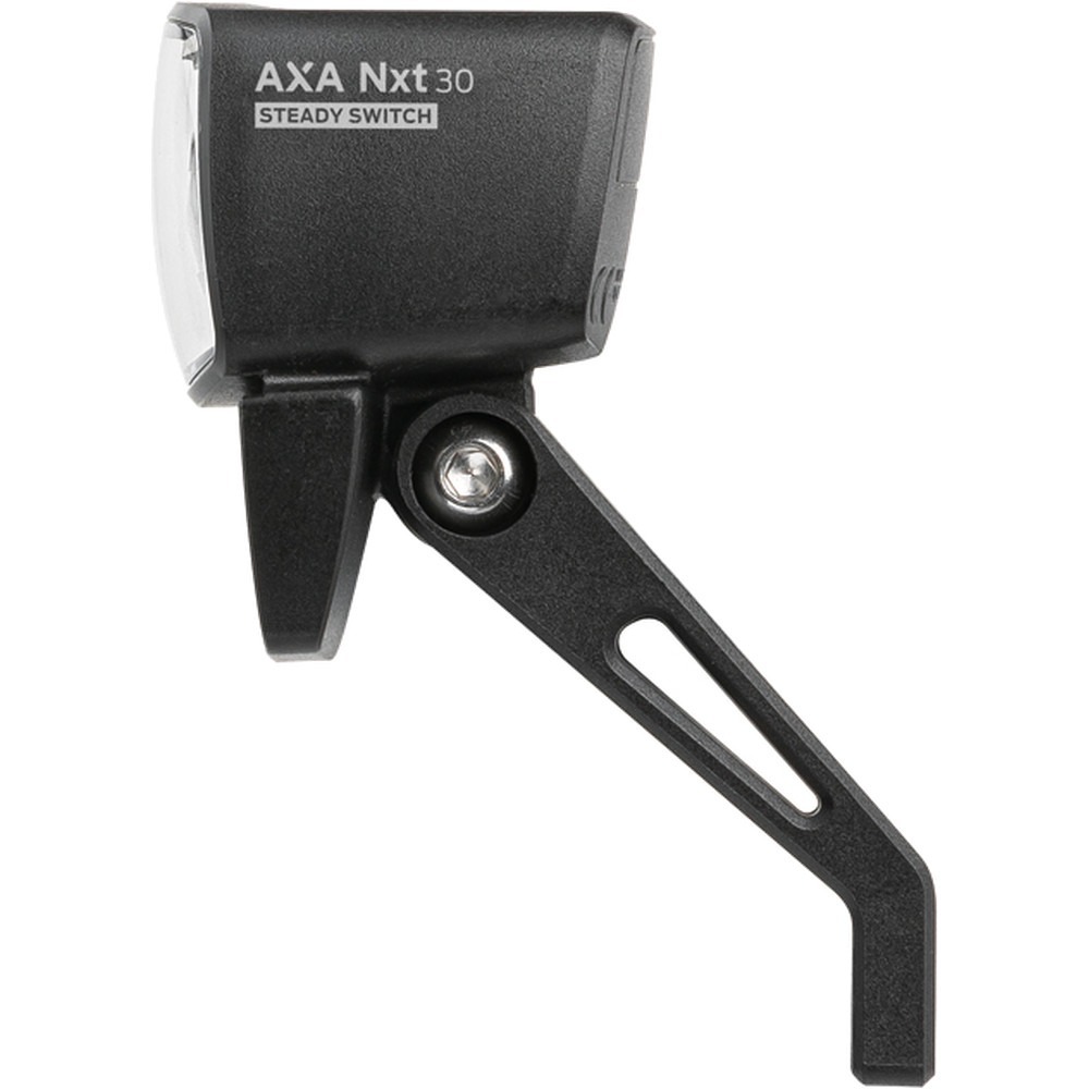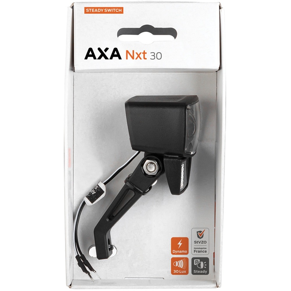 AXA Nxt 30 Steady to przednia lampka zasilana bezpośrednio przez dynamo roweru o mocy 30 luksów z przełącznikiem On/Off. Przednie światło ma prostokątny kształt, który idealnie wpasuje się w geometrię rowerów. Zintegrowany odblask to dodatkowa gwarancja bezpieczeństwa. Lampka jest na tyle wydajna, że oświetla pobocze, drogę na 50 metrów przed nami oraz generuje wystarczającą moc, aby inni uczestnicy drogi mogli nas zauważyć już z odległości 3000 metrów. W zestawie otrzymujemy uchwyt, dzięki któremu jesteśmy w stanie solidnie umiejscowić lampkę na widelcu roweru. Pasuje do wszystkich standardowych widelców. W razie potrzeby uchwyt na widelec można zastąpić sprzedanym oddzielnie uchwytem na kierownicę, aby zamontować lampkę na kierownicy.