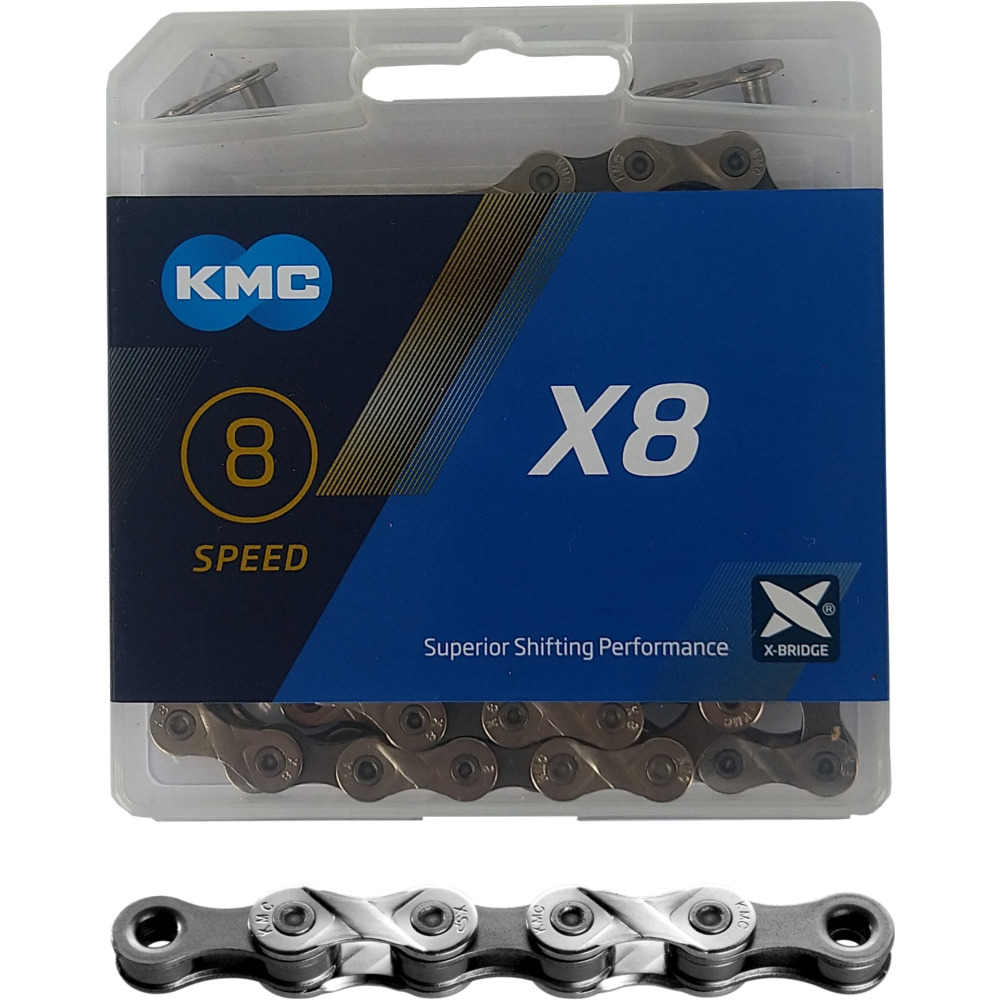 KMC X8 to wysokiej jakości łańcuch przeznaczony do napędów 8-, 7- i 6-rzędowych, który łączy w sobie lekkość, trwałość i precyzję działania. Dzięki zaawansowanej technologii, ten model wyróżnia się niezwykle niską wagą, co czyni go jednym z najlżejszych w swojej kategorii. Jest to idealny wybór zarówno dla rowerzystów preferujących jazdę MTB, jak i użytkowników rowerów trekkingowych czy crossowych. Konstrukcja X-Bridge została opracowana w celu zwiększenia szybkości oraz płynności zmiany przełożeń, co przekłada się na większy komfort i efektywność jazdy w zróżnicowanych warunkach terenowych.
