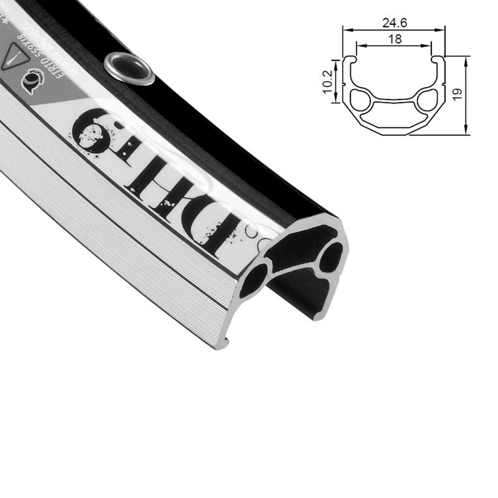 Alexrims DH19 to bardzo mocna, szeroka, trzykomorowa obręcz rowerowa przeznaczona dla bardziej zaawansowanych użytkowników. Kompatybilna z hamulcami v-brake. Ścianki boczne obrabiane CNC poprawiają jakość hamowania. Obręcz nadaje się do turystyki i jazdy w lekkim terenie. Powiększona szerokość zwiększa sztywność boczną, natomiast kapslowane otwory na szprychy umożliwiają zbudowanie mocniejszego koła. Dzięki trzem komorom, aluminiowa obręcz wyróżnia się zwiększoną odpornością na uszkodzenia i odkształcenia. Alexrims DH19 wyposażono również we wskaźnik zużycia.