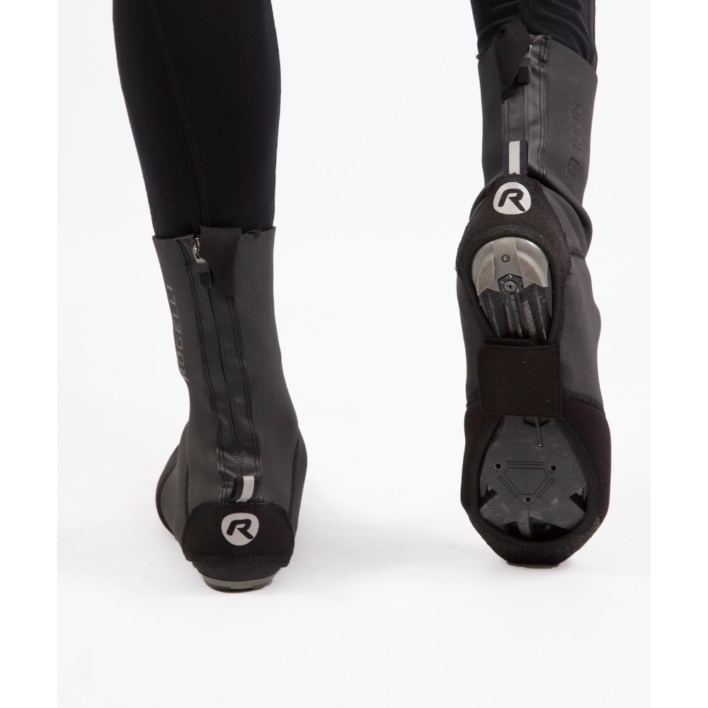 Pokrowce na buty Rogelli Neotec wykonane są z materiału Hydrotec. Jest to gumowany neopren, charakteryzujący się wysokim stopniem wodoodporności. Dzięki temu doskonale chronią obuwie i stopę przed przemoknięciem, nawet w czasie mocnych deszczów. Ochraniacze na buty Rogelli Neotec posiadają klejone szwy oraz wodoodporny zamek, które sprawiają, że jest to idealne rozwiązanie na mokre, chłodne dni. Dzięki laserowo przycinanej części górnej są dobrze dopasowane i zapewniają duży komfort użytkowania. Ochraniacze przeciwdeszczowe na buty Rogelli Neotec posiadają wzmocnione okolice palców i pięt, a pod spodem zaimplementowano specjalny rzep dla jeszcze lepszego dopasowania. Producent zadbał także o bezpieczeństwo kolarza, stosując elementy odblaskowe poprawiające widoczność na drodze, zwłaszcza po zapadnięciu zmroku.
