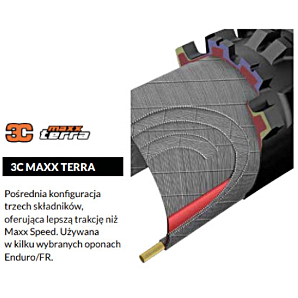 Technologia 3C MaxxTerra używana jest w kilku wybranych opcjach opon przeznaczonych do Enduro i FR. To specjalna konfiguracja składników, dzięki której udało się uzyskać znacznie lepszą trakcję, niż w oponach z technologią MaxxSpeed.