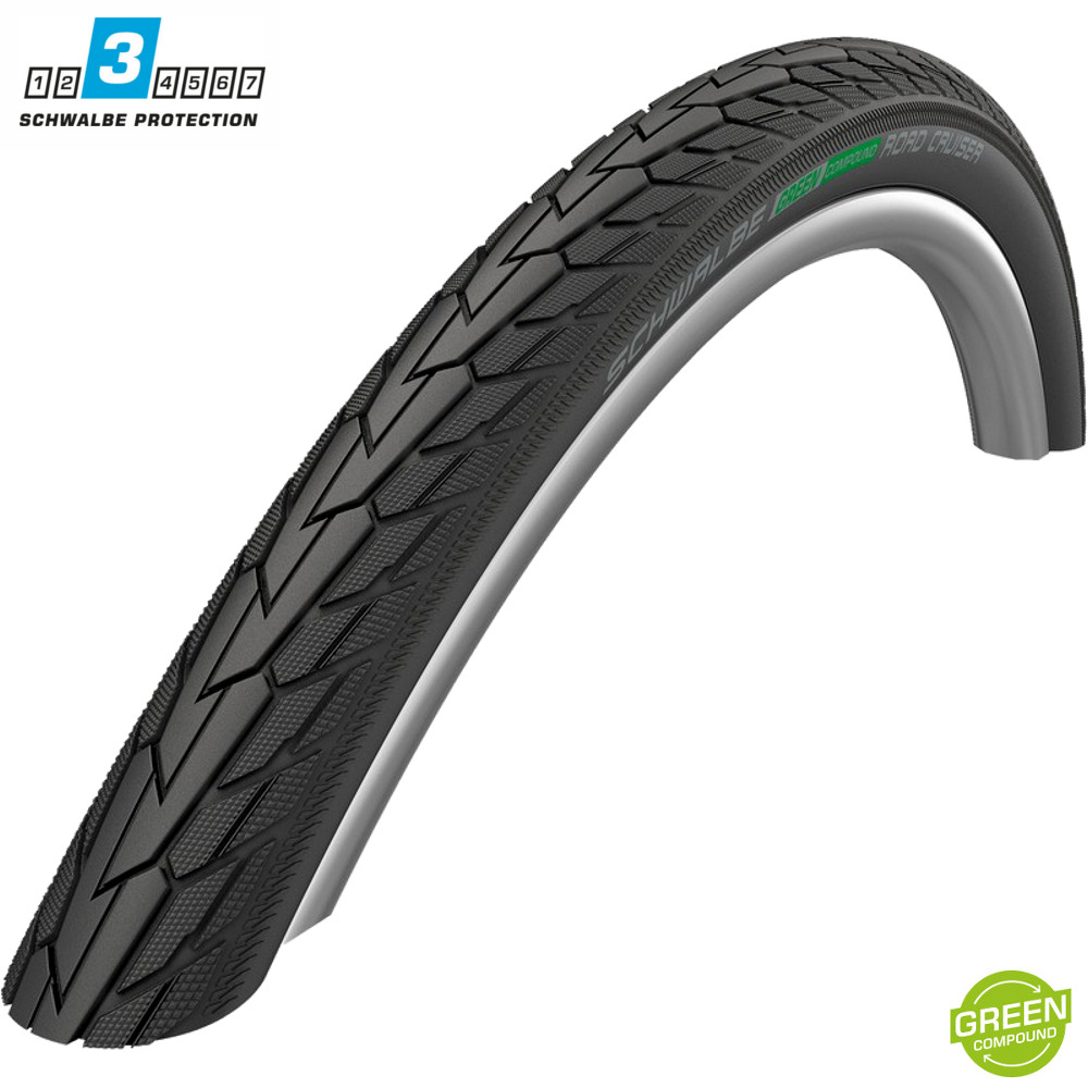 Schwalbe Road Cruiser to dynamiczna opona miejska, która łączy komfort jazdy z uniwersalnością zastosowania. Jej bieżnik został zaprojektowany tak, aby minimalizować opory toczenia, co gwarantuje płynną i ekonomiczną jazdę, a jednocześnie pozwala na pewne poruszanie się na nawierzchniach szutrowych. Opona wykorzystuje mieszankę gumy Green Compound, która zapewnia idealną równowagę między trwałością a komfortem jazdy, utrzymując niskie opory toczenia oraz doskonałą przyczepność nawet w trudnych warunkach.
