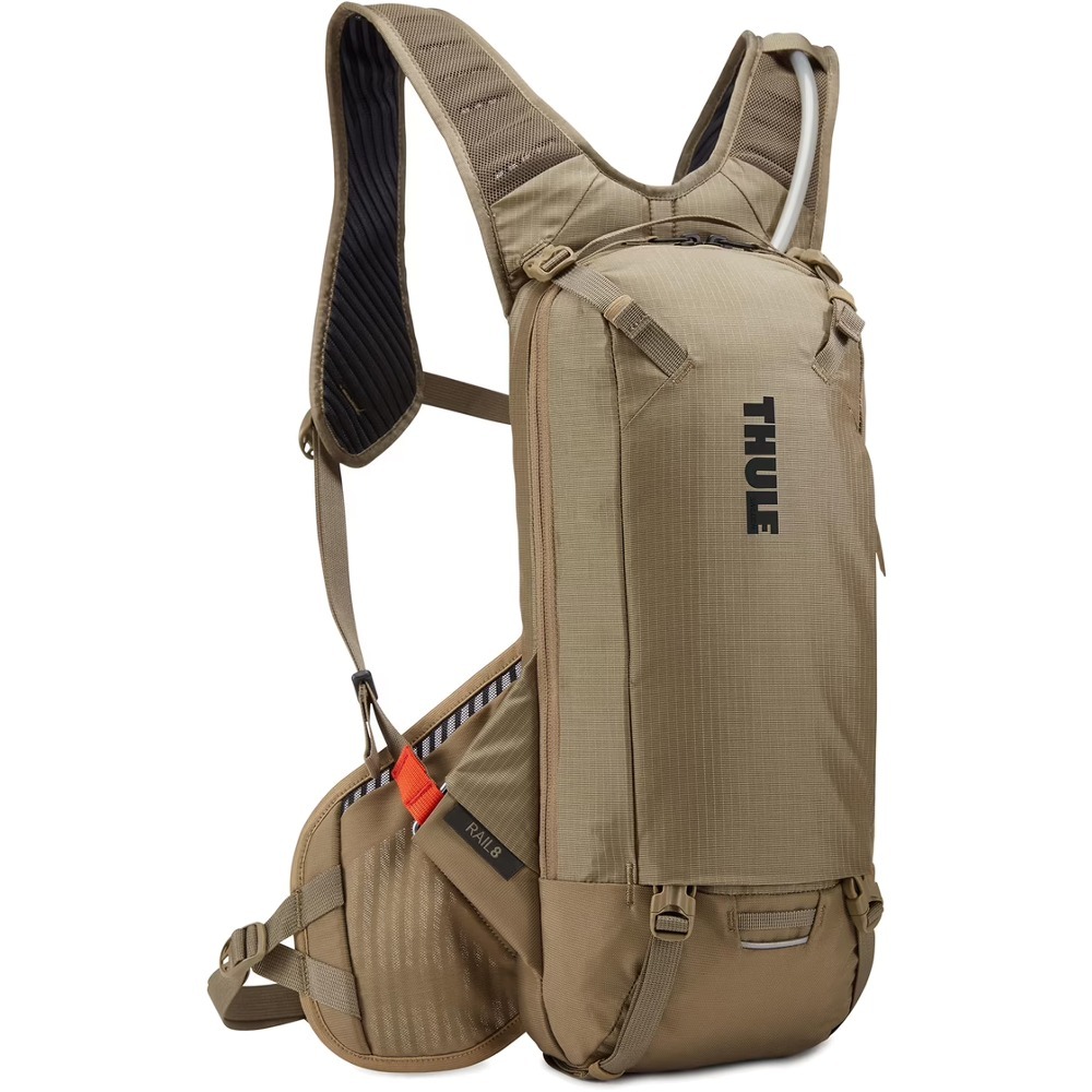 Thule Rail to lekki plecak wyposażony w bukłak na wodę HydraPak mieszczący 2,5 litra płynu. Bukłak posiada szczelny zawór i szeroko rozsuwane zamknięcie, które znacznie ułatwia jego czyszczenie. Zastosowany magnetyczny system chowania rurki ReTrakt zapewnia wysoki komfort użytkowania, gdyż nie wymaga nawet użycia rąk. Plecak oferuje także 8-litrową przestrzeń bagażową, w której bez problemu pomieścisz najpotrzebniejsze rzeczy. Posiada wygodne w użyciu dolne kieszenie oraz wewnętrzną kieszeń, która zmieści podstawowe narzędzia, pompkę, akcesoria rowerowe, czy prowiant. Plecak ma nisko pozłożony środek ciężkości, co pozwala na optymalne rozłożenie masy i komfort prowadzenia roweru poprzez ograniczenie obciążenia mięśni. Dla zapewnienia lepszej widoczności na drodze do plecaka można zamocować elementy odblaskowe i światła dzięki specjalnym pętelkom. Plecak został także wyposażony w wytrzymałą uprząż, która zapewnia odpowiednią stabilność podczas agresywnej jazdy i na wyścigach enduro.