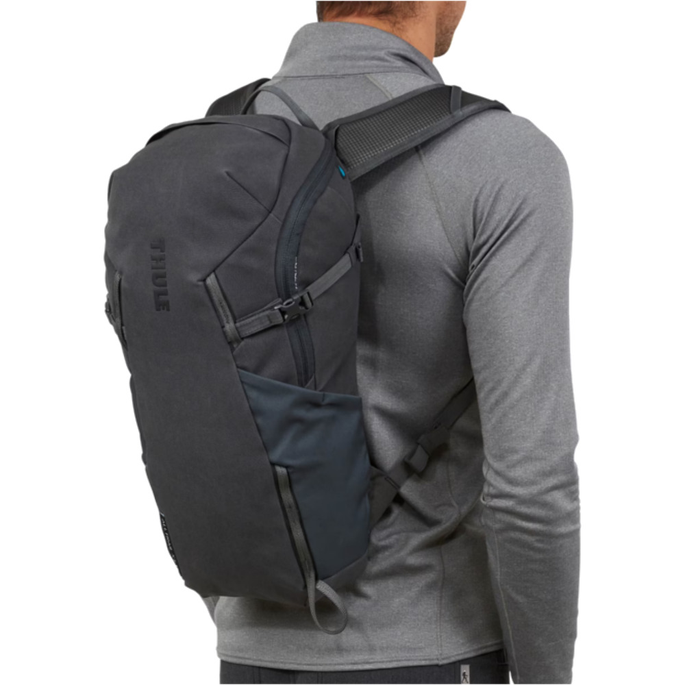 Thule AllTrail X to lekki, 15-litrowy plecak doskonale sprawdzający się podczas krótkich wycieczek na szlaku oraz w mieście. Plecak został w 50% wykonany z woskowanego brezentu poliestrowego z recyklingu. Materiał ten jest nawet 5 razy mocniejszy oraz bardziej wodoodporny niż tradycyjne woskowany brezent bawełniany. Plecak posiada pętle mocujące, które służą do przypięcia kijków trekkingowych, czy czekanów. Sprzęt można też mocować do zewnętrznej strony plecaka za pomocą pasów kompresyjnych. W pokrywie plecaka umieszczono zapinaną na zamek kieszonkę, do której można schować potrzebne drobiazgi. Kolejna niewielka kieszonka została umiejscowiona na pasie naramiennym. Podczas ciepłej, słonecznej pogody doskonały komfort oferują wentylowane pasy naramienne oraz tylny panel. Dodatkowo podczas wyprawy warto się stale nawadniać. W tym celu plecak Thule AllTrail X został przystosowany do umieszczenia bukłaka na wodę, który nie wchodzi w skład zestawu i można go dokupić oddzielnie. Plecak posiada również regulowany, odpinany pas piersiowy oraz chowany pas biodrowy, które zapewniają odpowiednią stabilność oraz komfort podczas wypraw.