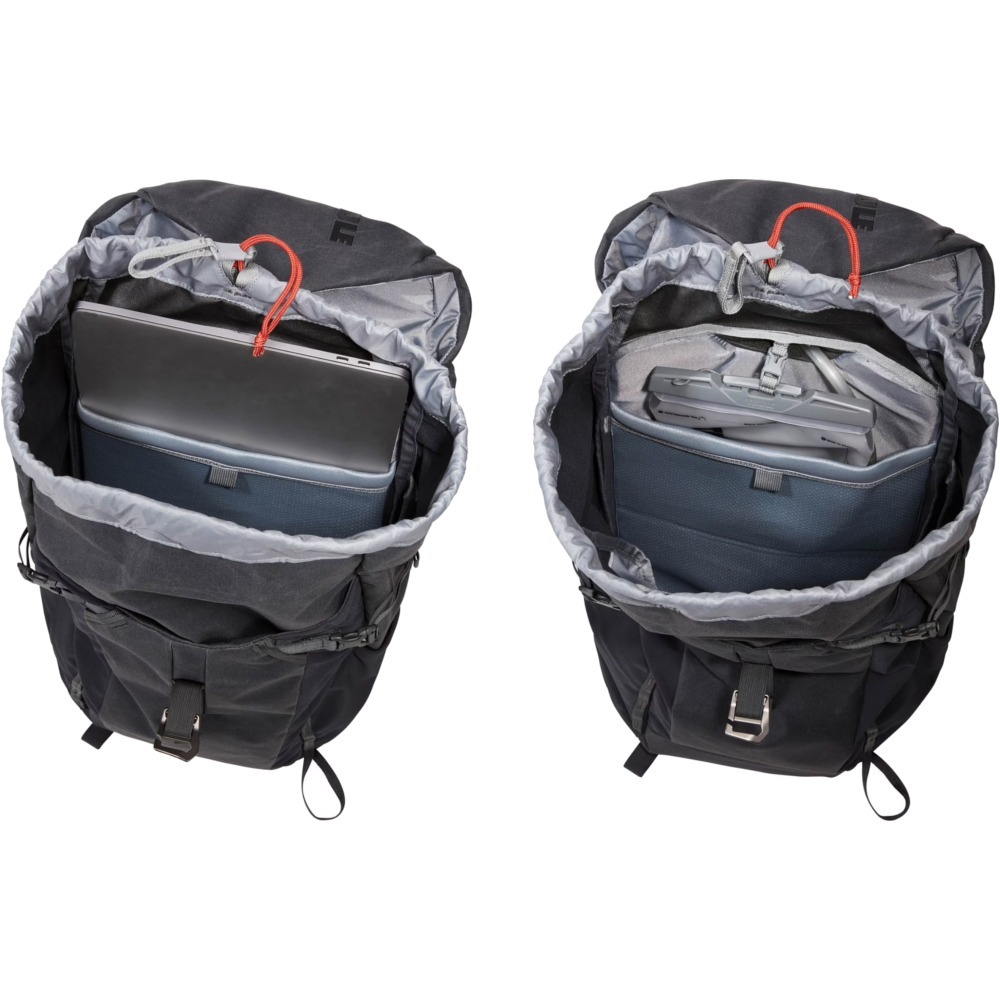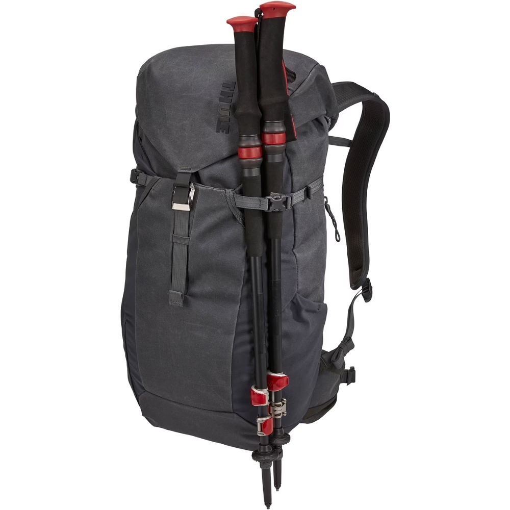 Thule AllTrail X to plecak, który doskonale sprawdza się podczas krótkich wycieczek na szlaku oraz w mieście. Plecak został w 50% wykonany z woskowanego brezentu poliestrowego z recyklingu. Materiał ten jest nawet 5 razy mocniejszy oraz bardziej wodoodporny niż tradycyjne woskowany brezent bawełniany. Plecak posiada pętle mocujące, które służą do przypięcia kijków trekkingowych, czy czekanów. Sprzęt można też mocować do zewnętrznej strony plecaka za pomocą pasów kompresyjnych. Na pasie naramiennym umieszczono zapinaną na zamek kieszonkę, do której można schować potrzebne drobiazgi. Plecak posiada również wewnętrzną kieszeń z przewiewnej siatki pozwalającą zmieścić nawet 15-calowego MacBooka. Podczas ciepłej, słonecznej pogody doskonały komfort oferuje wentylowany tylny panel. Plecak posiada również chowany pas biodrowy, który zapewnia odpowiednią stabilność oraz komfort podczas wypraw.