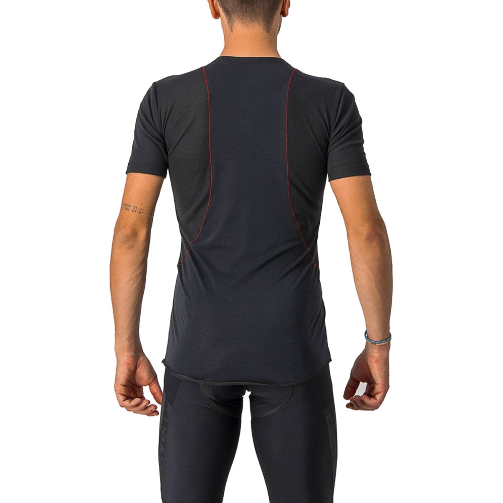 Podkoszulek rowerowy Castelli Prosecco Tech posiada też płaskie szwy, dzięki temu nie uwiera i nie powoduje skóry nawet w czasie długotrwałej jazdy. Wycięcie przy szyi zapewnia lepsze dopasowanie do koszulek i bluz kolarskich pozbawionych kołnierzyka.