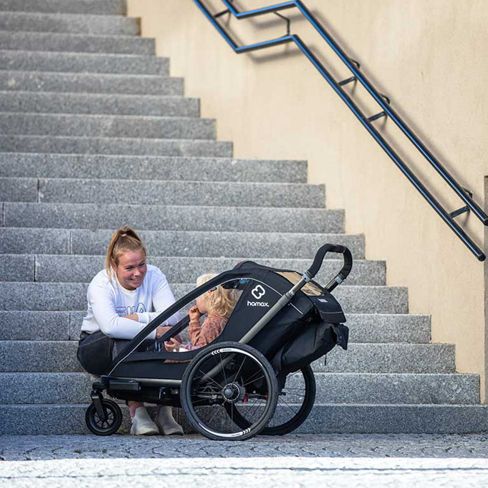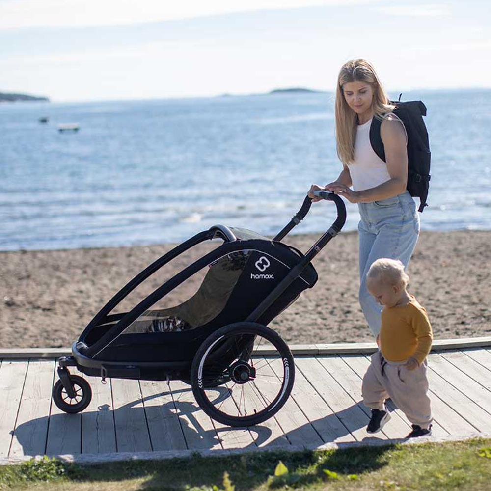 Hamax Breeze to najnowszy model o sportowym wyglądzie skandynawskiego producenta. Wielofunkcyjna przyczepka do przewozu dzieci jest bardzo wygodna i bezpieczna. Solidna aluminiowa rama zapewnia optymalną ochronę dzieci oraz dużo przestrzeni w kabinie. Hamax Breeze to wszechstronny model, który może być używany zarówno jako przyczepka rowerowa, wózek spacerowy, jak i przyczepka do biegania.