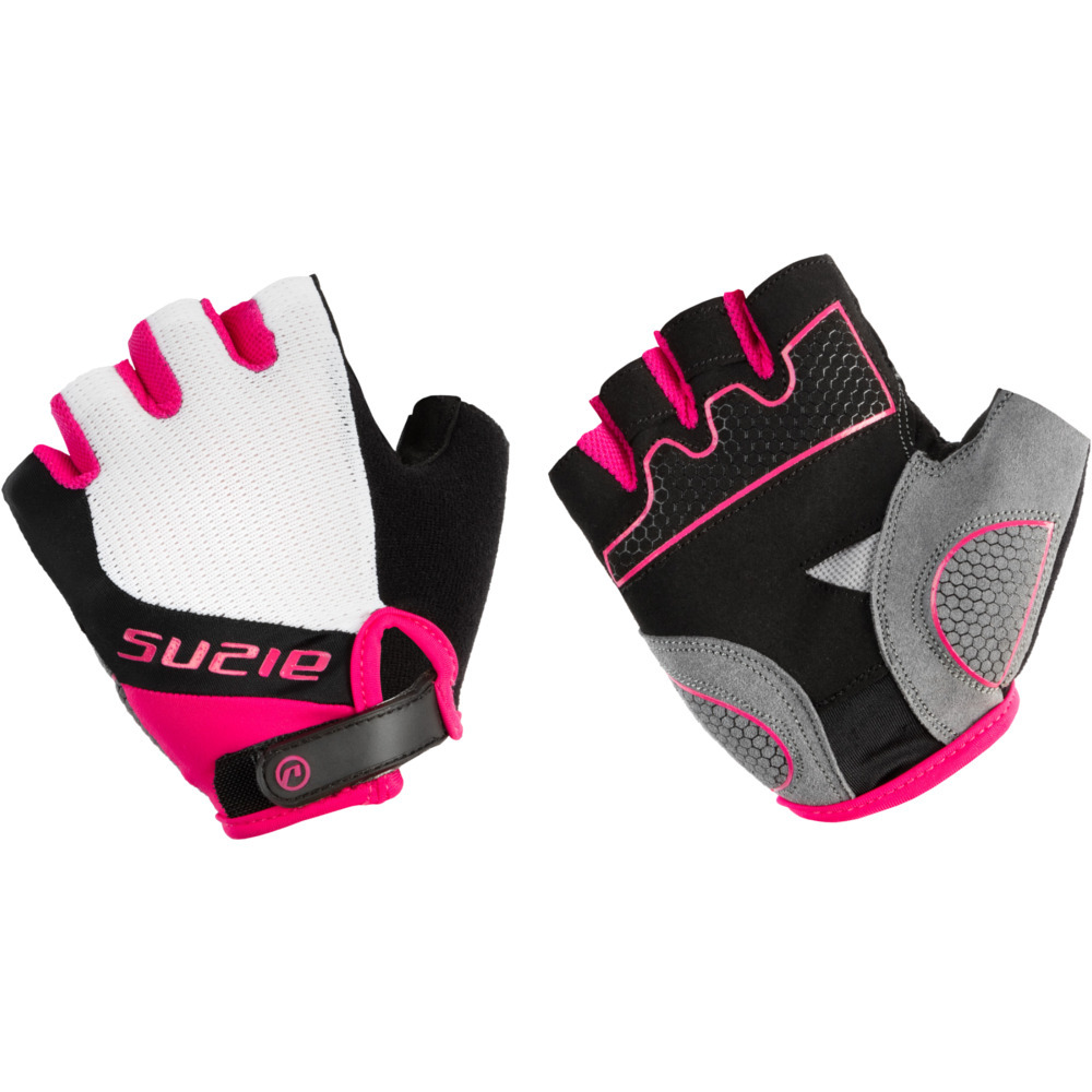 Dziewczęce rękawiczki kolarskie z serii Suzie, w której występują także rowery dziecięce dedykowane dziewczynkom. Rękawiczki są wygodne i dobrze wentylowane. Dopasują się do dłoni dzięki elastycznym materiałom i zapięciu na rzepy. Wewnętrzna strona uzupełniona wkładkami żelowymi dla większego komfortu trzymania kierownicy. Kciuk wzmocniony i wykonany z materiału frotte.