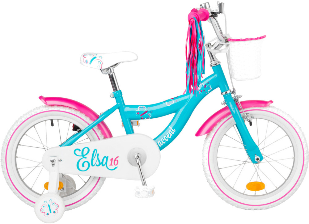 Dziecięcy rower Elsa marki Accent na kołach w rozmiarze 16 cali z szerokimi oponami gwarantującymi większą stabilność w trakcie jazdy. Rower posiada także wytrzymałe boczne kółka, które zapewniają regulację wysokości. Kształt ramy z obniżoną górną rurką zapewnia łatwiejsze wsiadanie i zsiadanie, a wygodne siodełko pozwala zapewnić wysoki komfort podczas jazdy. Hamulec w tylnej piaście oraz przedni typu V-Brake umożliwiają dziecku instynktowne oraz pewne hamowanie. Rower Accent Elsa został także wyposażony w dzwonek oraz ozdobny koszyk z przodu. Światła odblaskowe roweru czuwają nad bezpieczeństwem dziecka poprawiając jego widoczność na drodze w gorszych warunkach pogodowych.