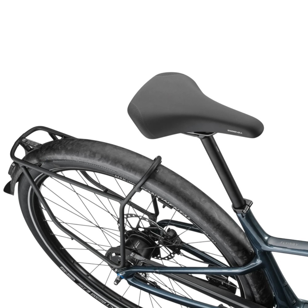 Konstrukcja ramy e-bike’a FlyingV 2 swą formą nawiązuje do kultowego projektu firmy, jednocześnie została przemyślana tak, by jak najlepiej odpowiadać potrzebom miejskich cyklistów. Rama i widelec wykonane są z włókna węglowego (karbonu), dzięki czemu rower zachowuje wyjątkową lekkość i sztywność. Co istotne, producent zastosował również pierwsze w historii marki karbonowe błotniki, które idealnie komponują się z całością projektu. Geometria ramy została opracowana tak, by zapewnić rowerzyście naturalną, wyprostowaną pozycję i pełną kontrolę nad tym, co dzieje się na drodze.
