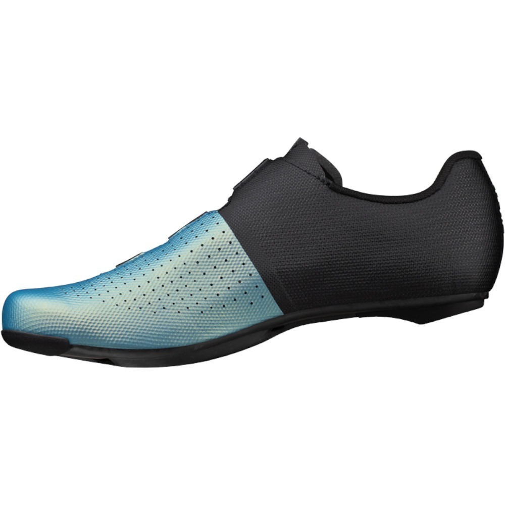 Podeszwa wyposażona została w kanały wentylacyjne, które sprawnie chłodzą stopy podczas intensywnych treningów. Za zapięcie odpowiada pojedyncze pokrętło BOA Li2 z dwukierunkową mikroregulacją pozwalającą na precyzyjne dopasowanie buta do stopy nawet podczas jazdy. Pozycja bloków została lekko przesunięta dla poprawy efektywności pedałowania oraz minimalizacji ryzyka kontuzji kolan. Całość podkreśla odważna, opalizująca błękitna kolorystyka.