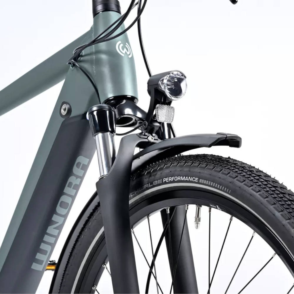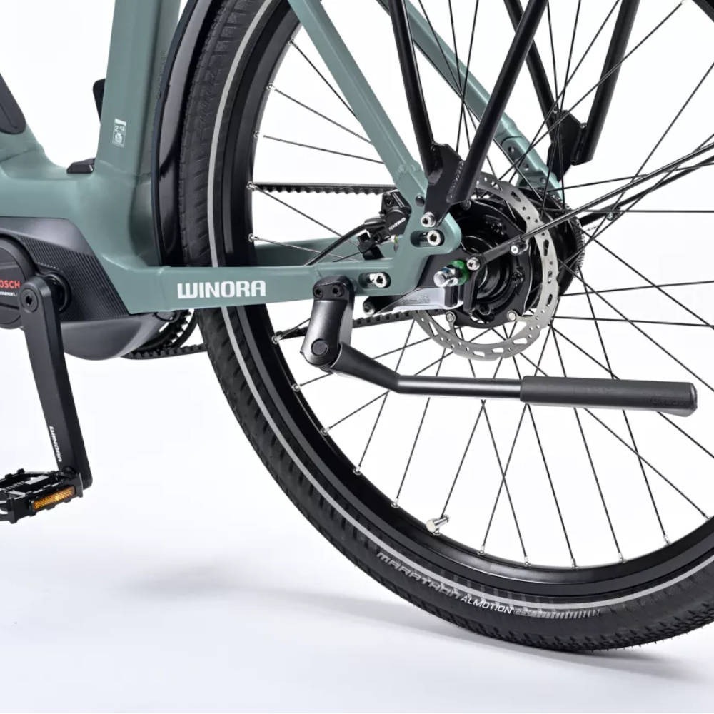 Jako że Winora Sinus R8E High to miejski rower elektryczny z prawdziwego zdarzenia – niemieccy twórcy wyposażyli go w szereg dodatkowych akcesoriów ułatwiających i umilających jazdę po terenie zabudowanym (i nie tylko). E-bike dysponuje błotnikami, lampką przednią i tylną, stopką oraz bagażnikiem.