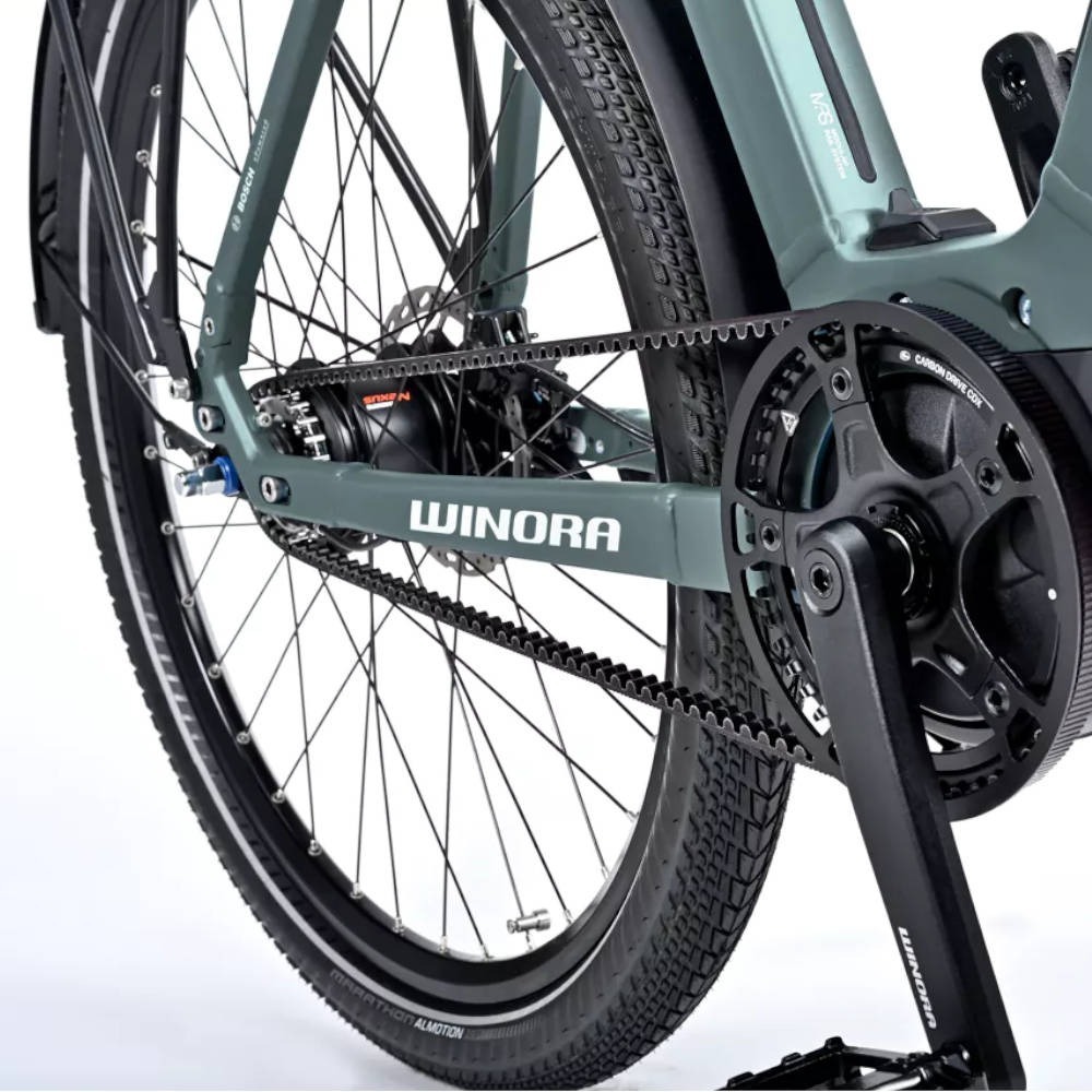 Warto także zwrócić uwagę na napęd 8-biegowy Shimano Nexus i tarczowe hamulce Tektro HD-T275. Przerzutki umieszczono w piaście, co w połączeniu z paskiem napędowym Gates CarbonDrive zastępującym w tym e-bike’u łańcuch sprawia, że Winora Sinus R8E High jest w konserwacji i użytkowaniu wyjątkowo prostym rowerem – idealnym dla początkujących oraz osób starszych!