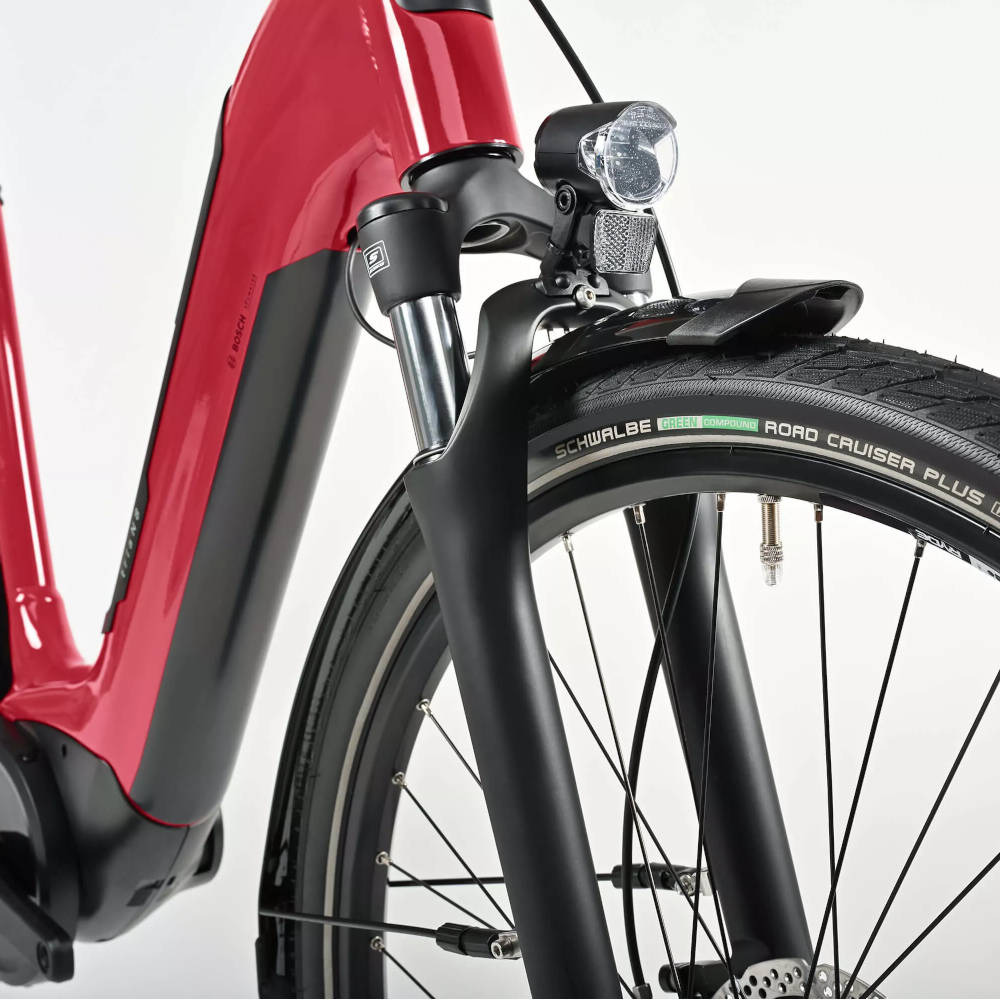 Jednoślad, ponieważ należy do rowerów miejskich, wzbogacony został o szereg cennych dodatków. W pakiecie z e-bikiem otrzymasz: komplet oświetlenia (Herrmans MR5 i AXA Juno Ebike), zestaw błotników (Eurofender Tempo 28), bagażnik z system MIK oraz stopkę rowerową i osłonę łańcucha.