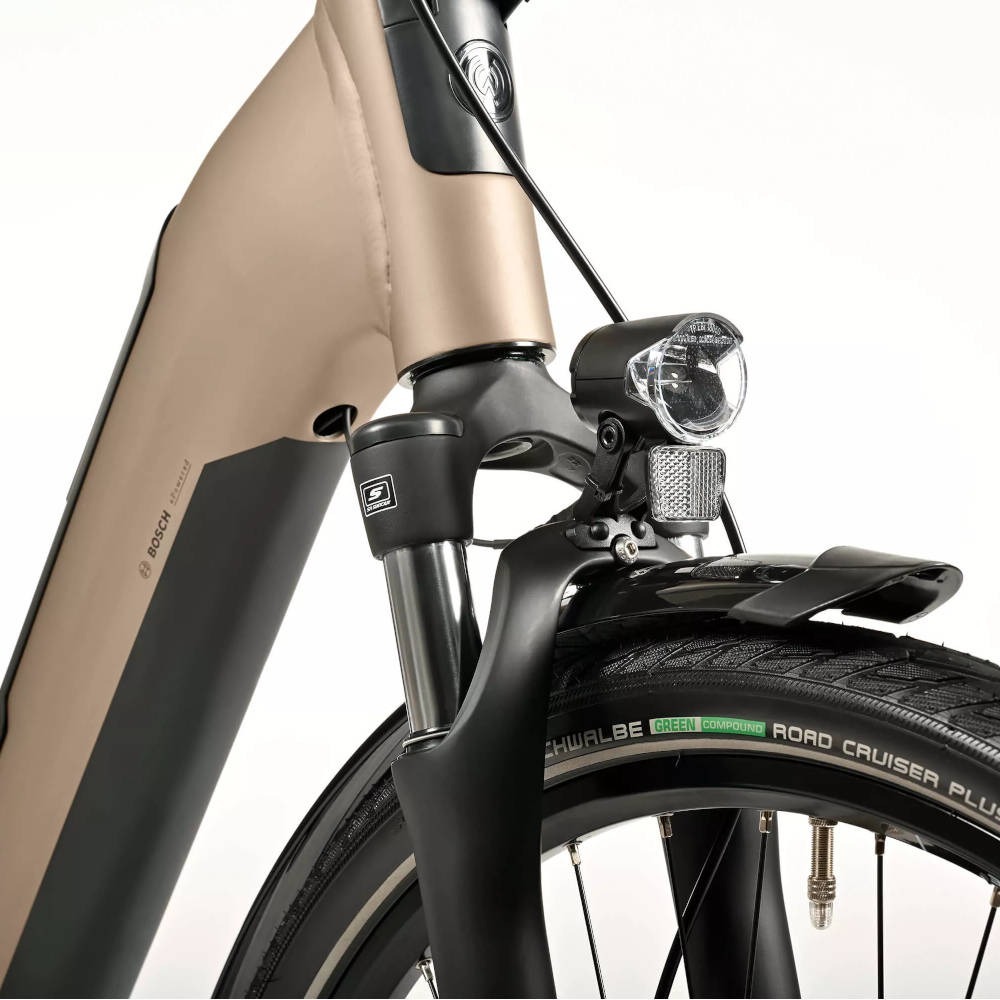 Twórcy wzbogacili e-bike Winora Tria N8 E o szereg dodatkowych udogodnień. W komplecie znajdziesz oświetlenie przednie i tylne, osłonę łańcucha, błotniki, stopkę oraz bagażnik tylny.